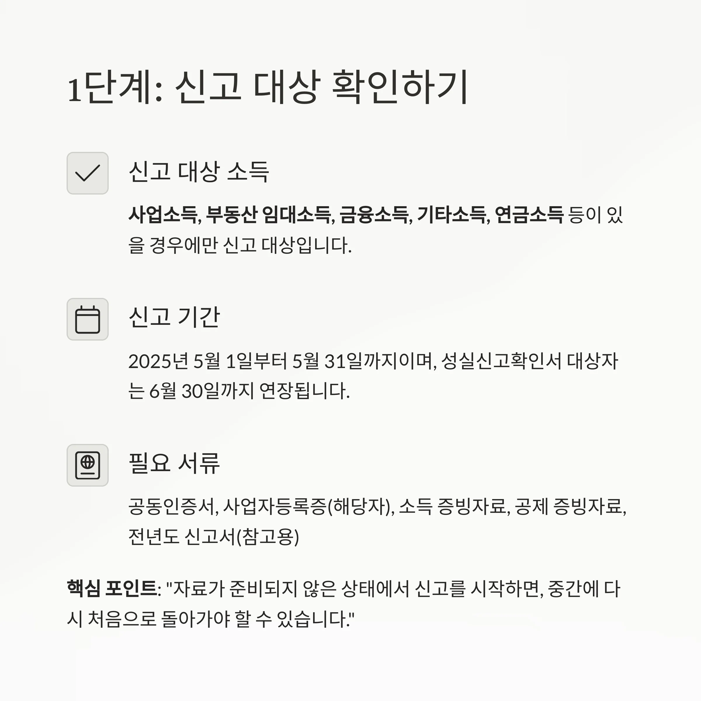 | 1단계 준비 | 신고 대상 확인, 서류 준비 | 5월 1일~31일, 인증서, 증빙자료 |