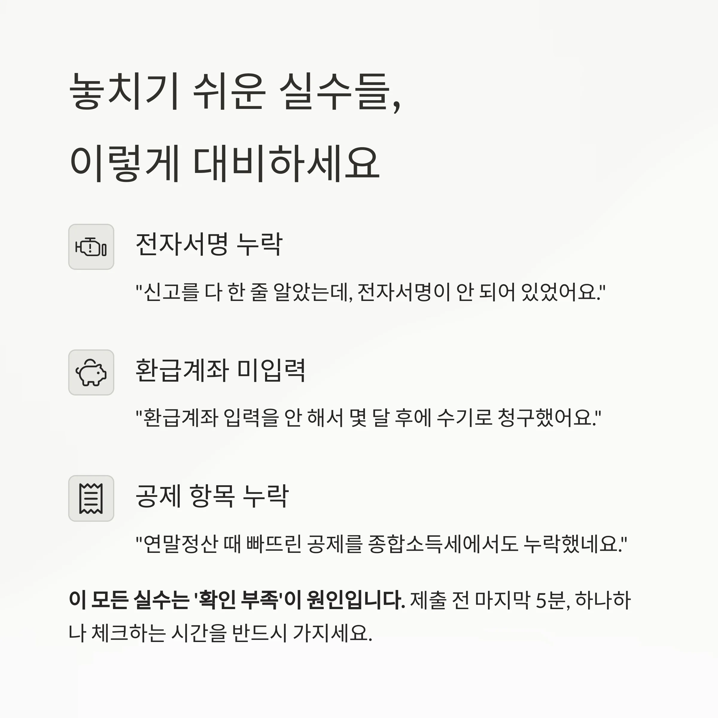 처음 접하는 분들이 가장 많이 하는 실수는 ‘신고 대상인지 여부’와 ‘공제 누락’입니다.