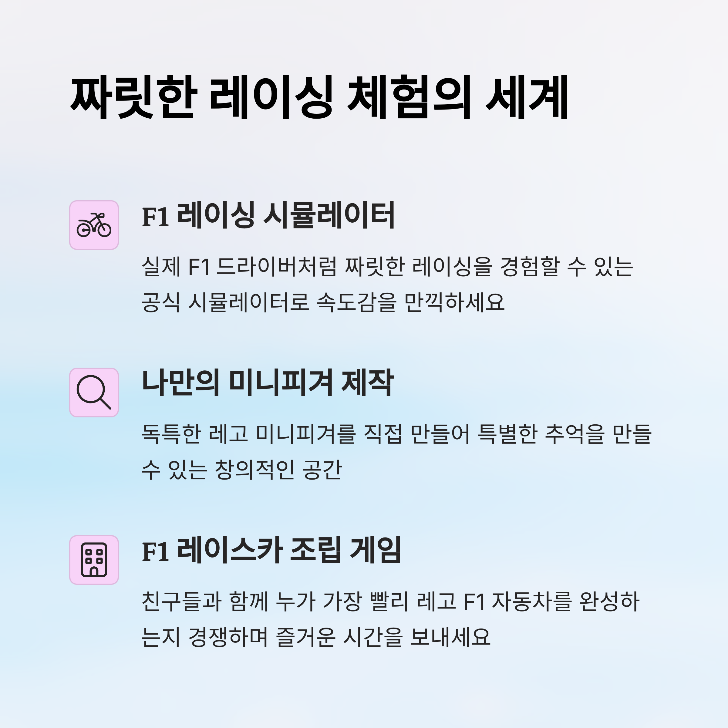 주요 프로그램 F1 시뮬레이터, 피겨 만들기, 레이스카 조립