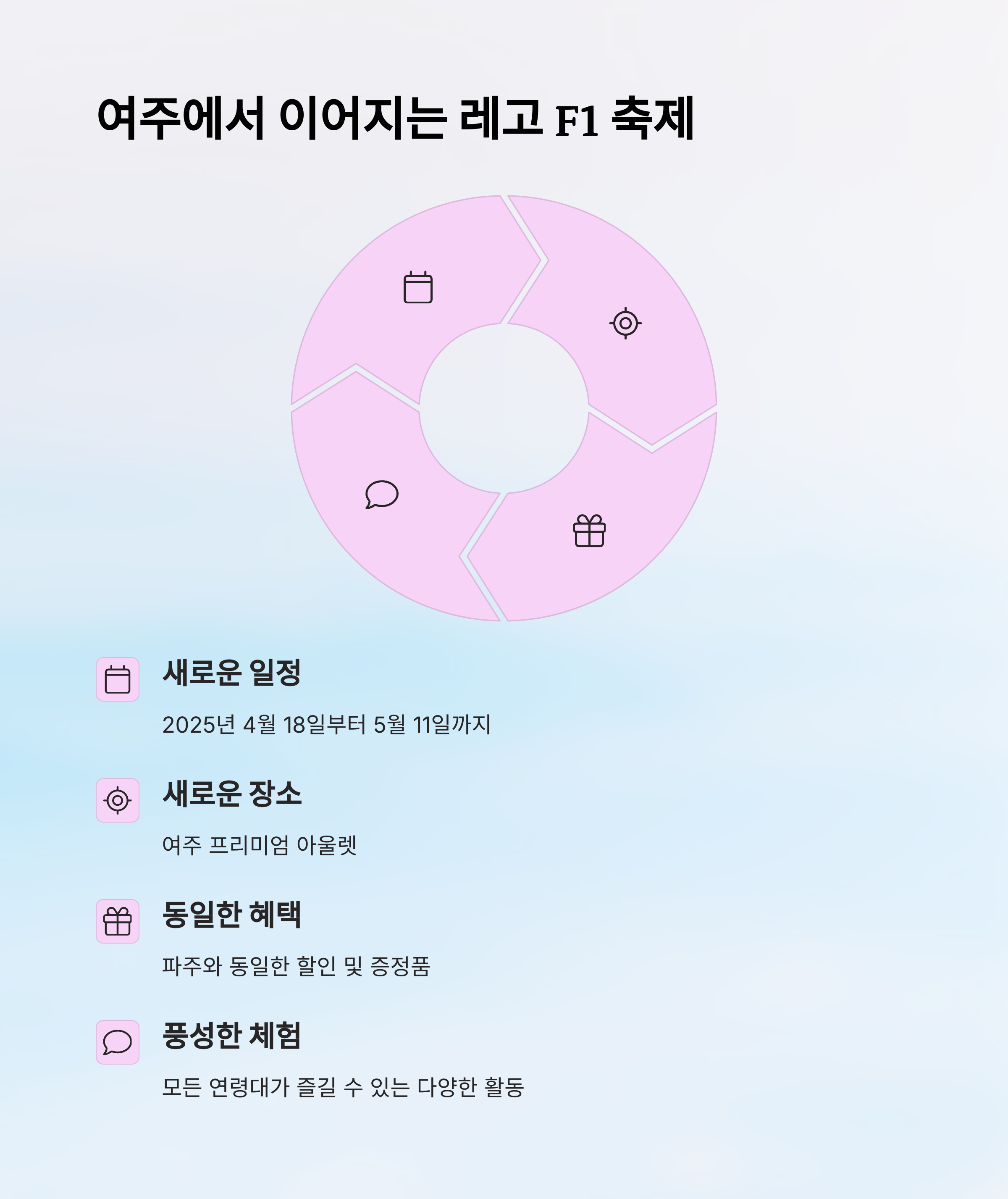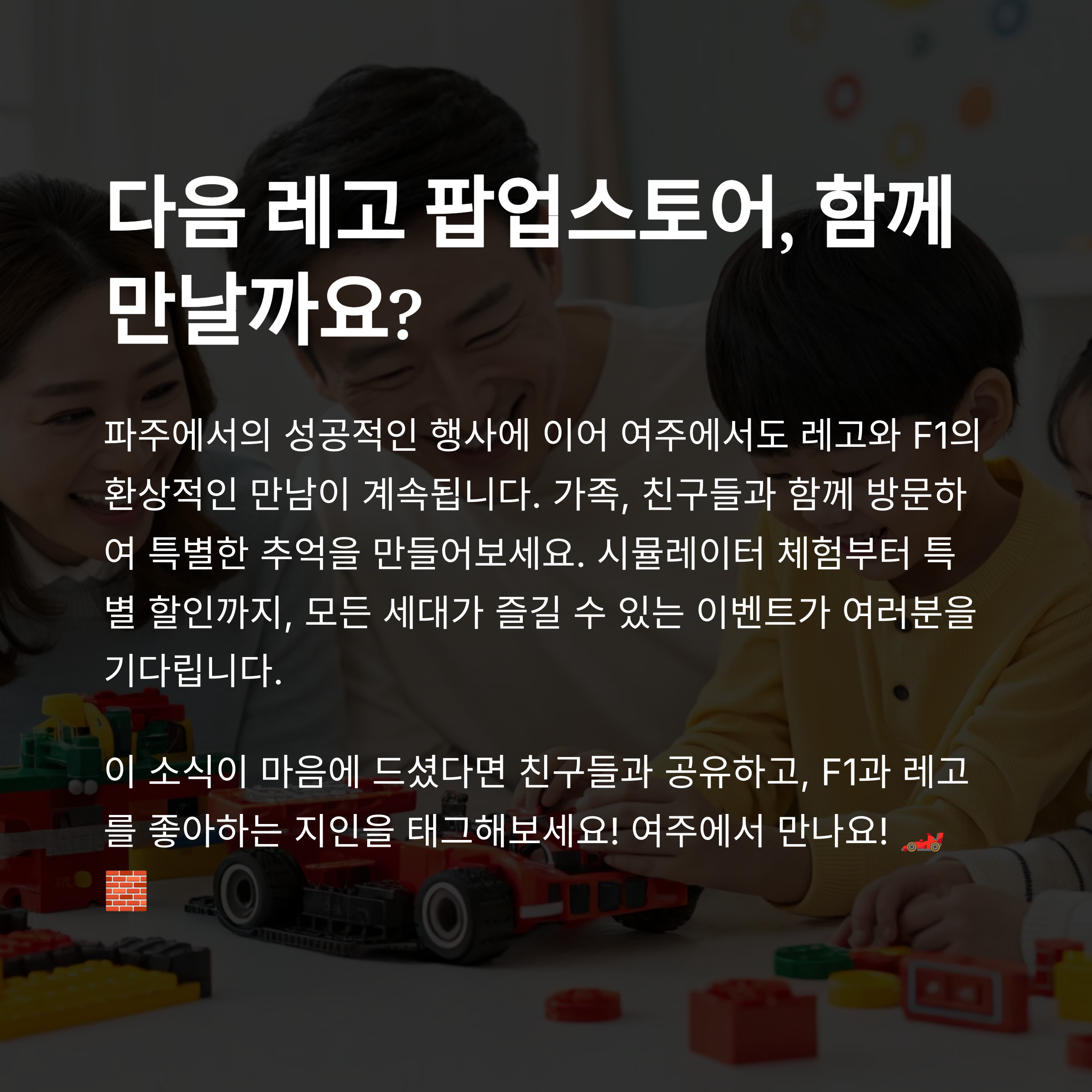 파주 프리미엄 아울렛에서 성황리에 진행된 레고 팝업 스토어는 단순히 레고 제품을 전시하는 공간을 넘어, 방문객 모두에게 색다른 즐거움을 선사하는 복합 체험형 행사였습니다. F1 테마의 다양한 프로그램, 풍성한 할인 혜택, 그리고 구매 고객을 위한 사은 이벤트까지, 레고 팬이라면 절대 놓칠 수 없는 기회였습니다. 아쉽게도 파주 행사는 마무리되었지만, 여주 프리미엄 아울렛에서 또 한 번 여러분을 기다리고 있으니 가족, 친구들과 함께 방문하셔서 소중한 추억을 만들어 보세요.