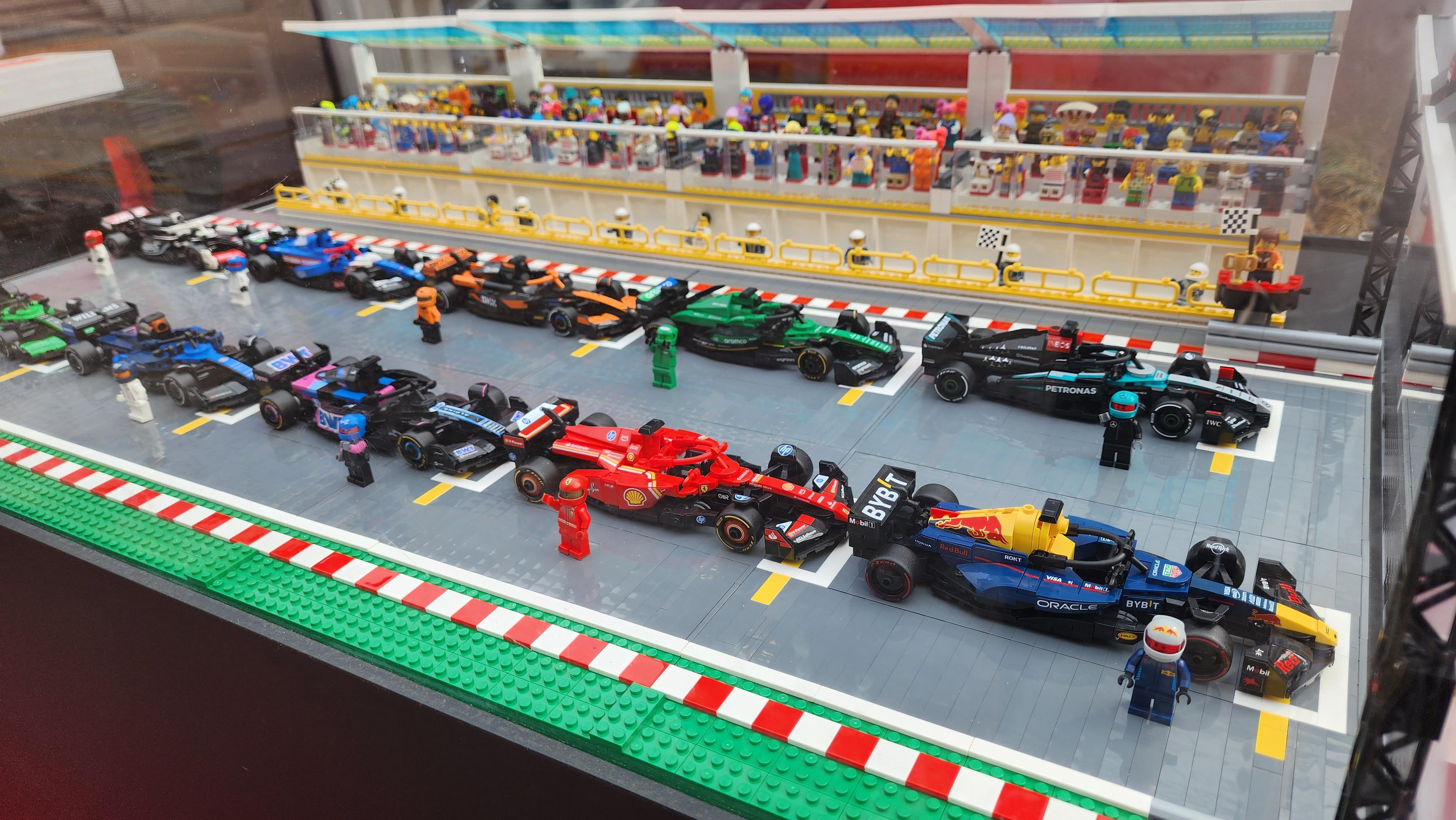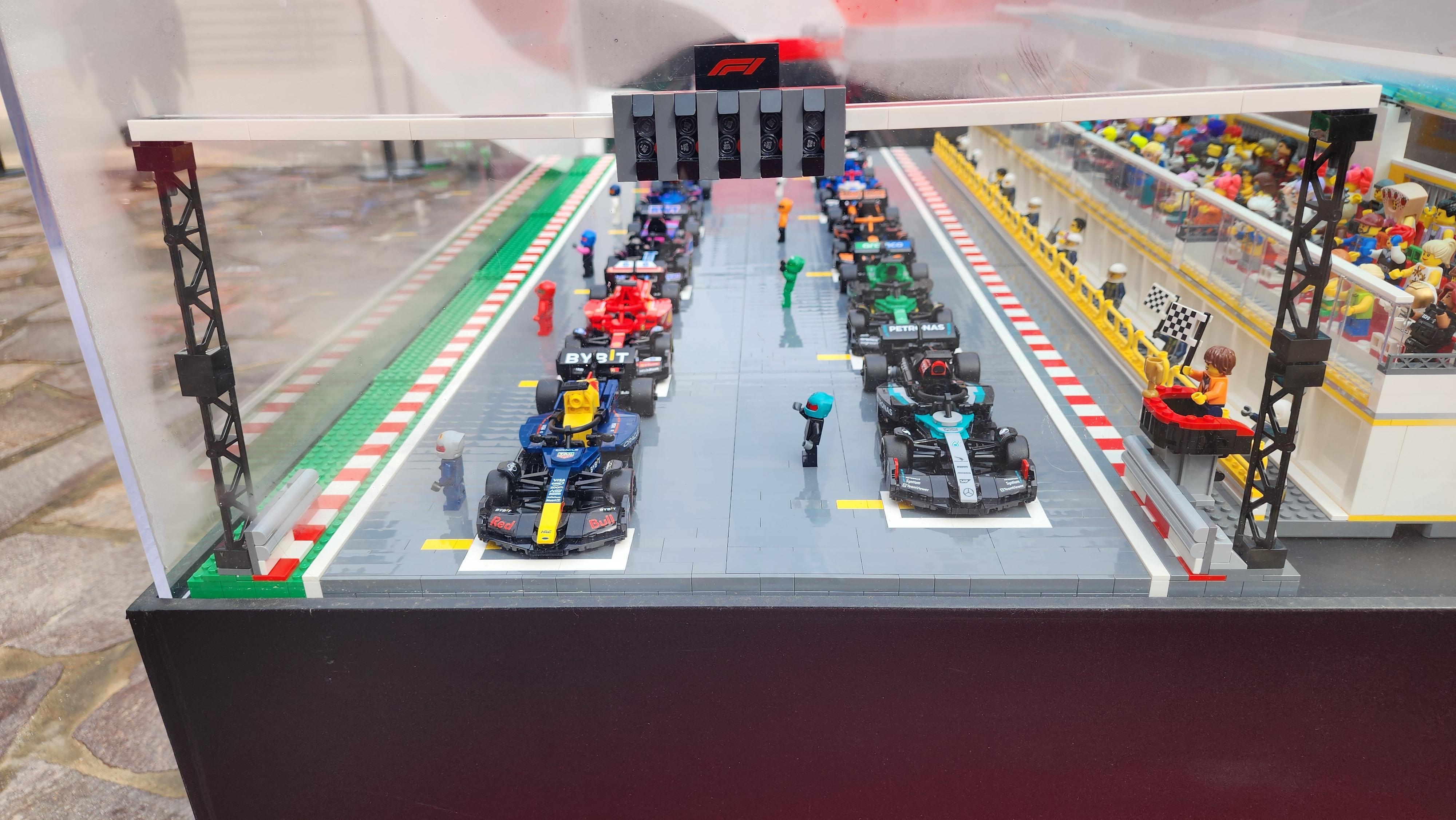 쇼케이스에 전시된 10종 F1 레이싱카의 디오라마