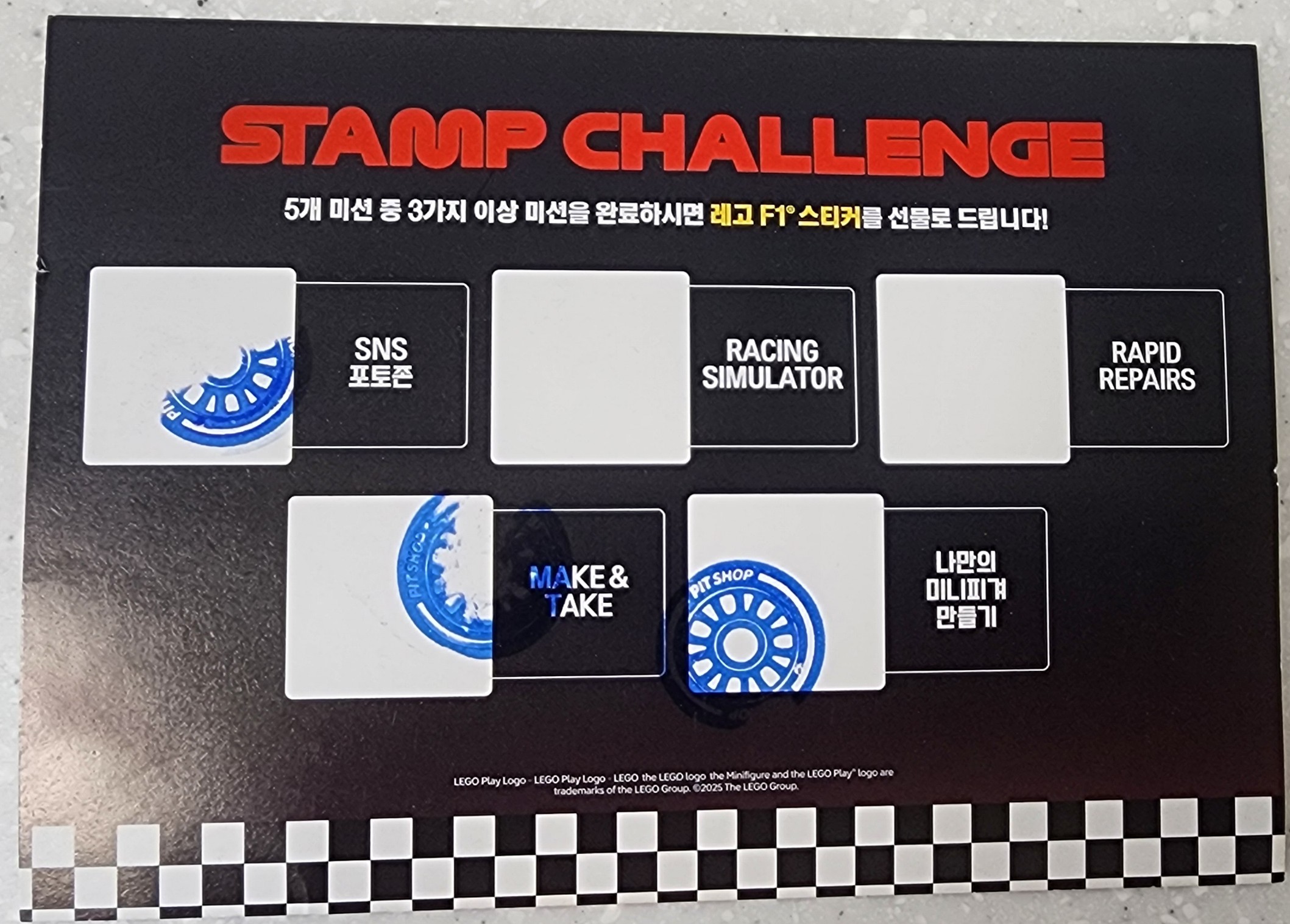 이벤트에서는 스탬프 투어도 함께 진행되어, F1 시뮬레이터, 피겨 만들기, 레이스카 조립 체험 등 주요 프로그램을 완료하고 스탬프를 모으면 레고 F1 스티커를 받을 수 있었습니다.