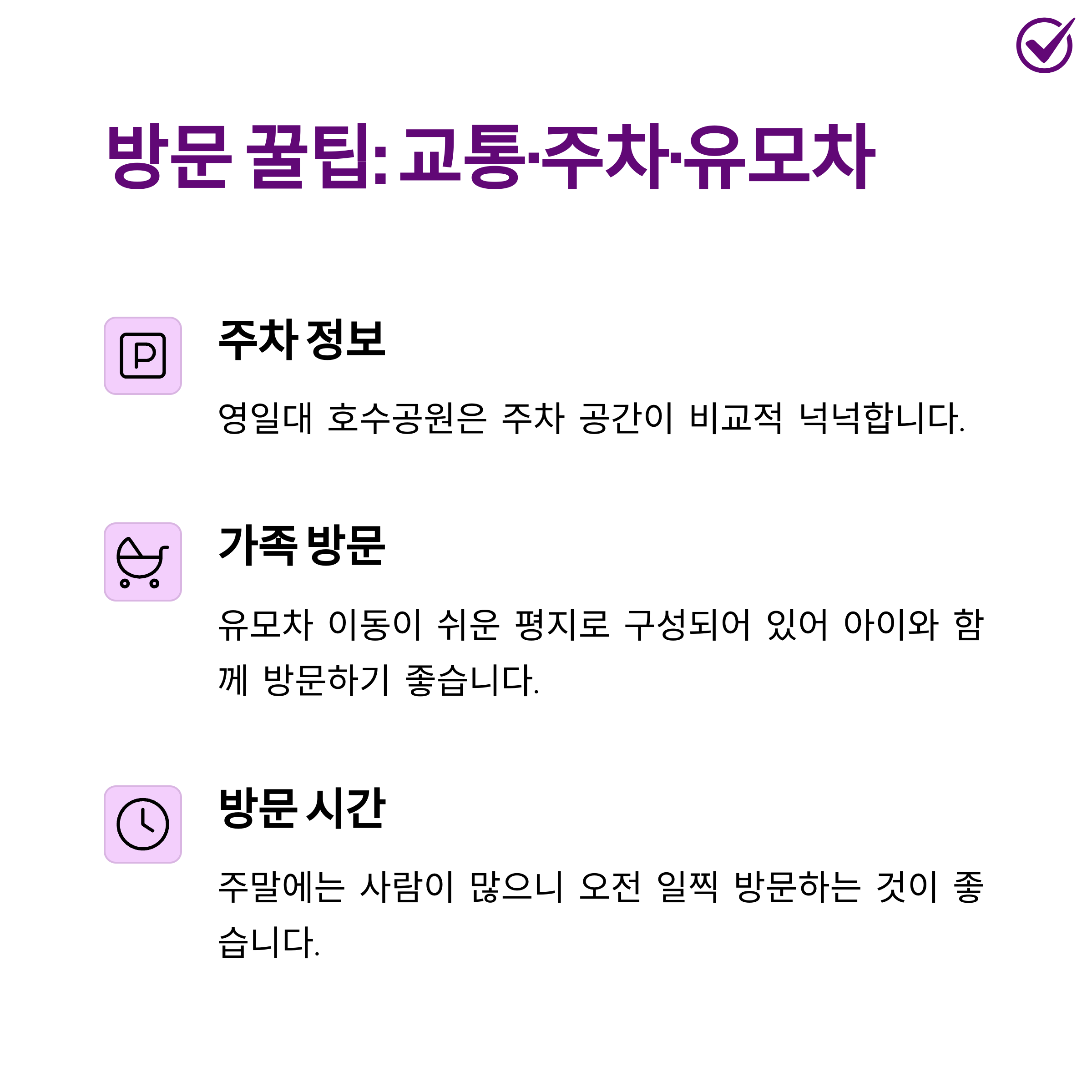 영일대 호수공원은 넓은 주차장과 유모차 이동이 가능한 산책로가 특징입니다.