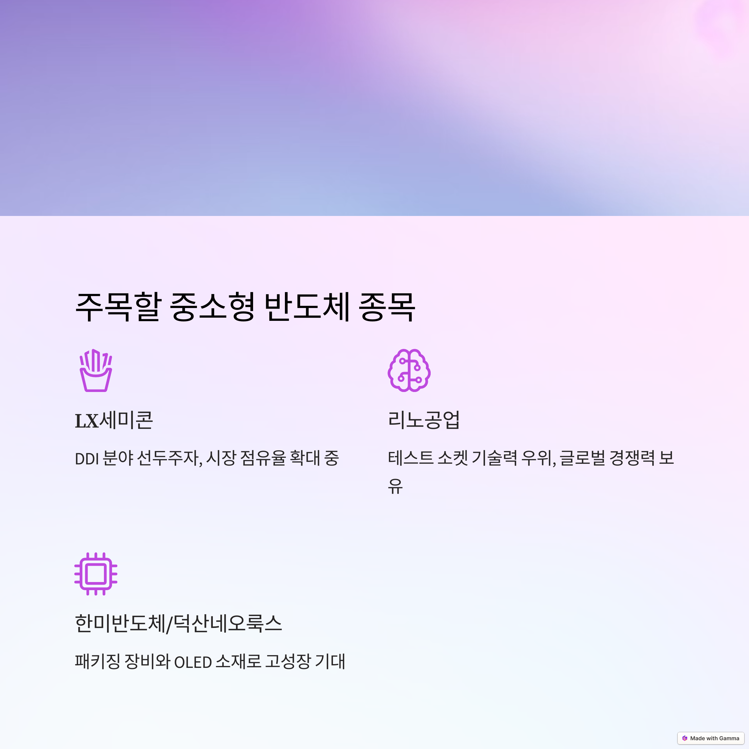 이 기업들은 상대적으로 낮은 시가총액을 보유하고 있어 성장성이 크며, 특정 반도체 산업 내에서 핵심 기술력을 보유하고 있습니다.