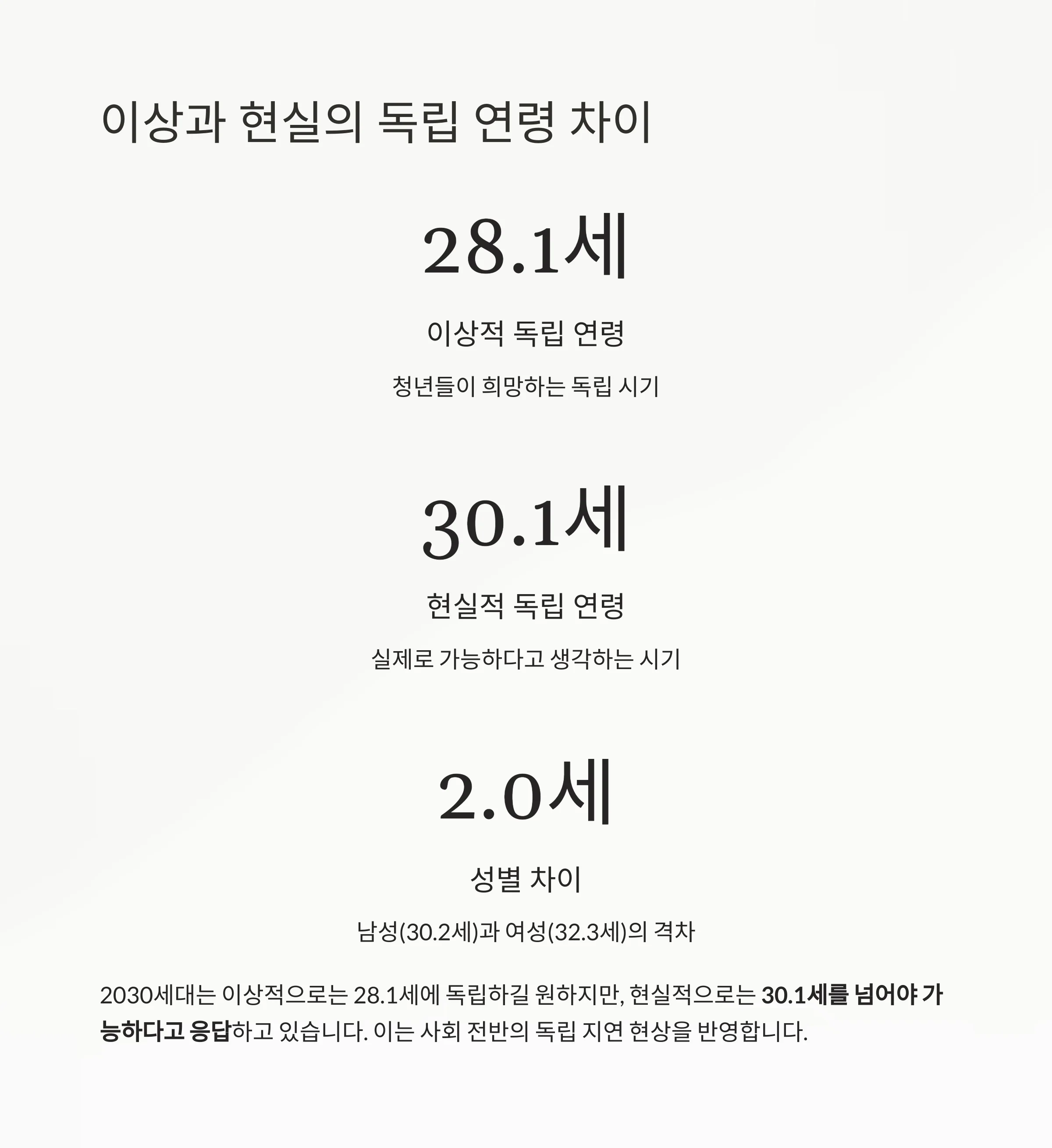 2030세대는 이상적으로는 28.1세에 독립하길 원하지만,