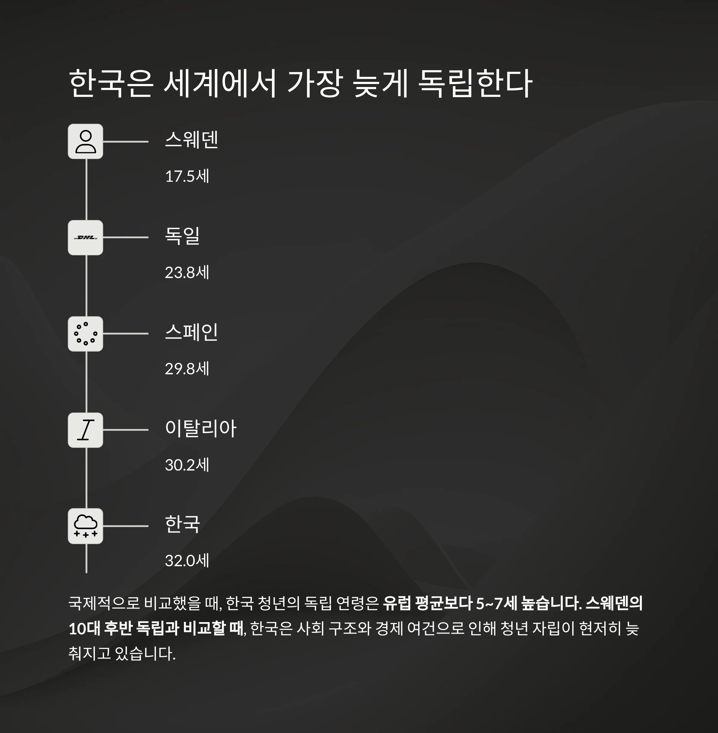 한국은 사회 구조와 경제 여건으로 인해 청년 자립이 현저히 늦춰지고 있습니다.