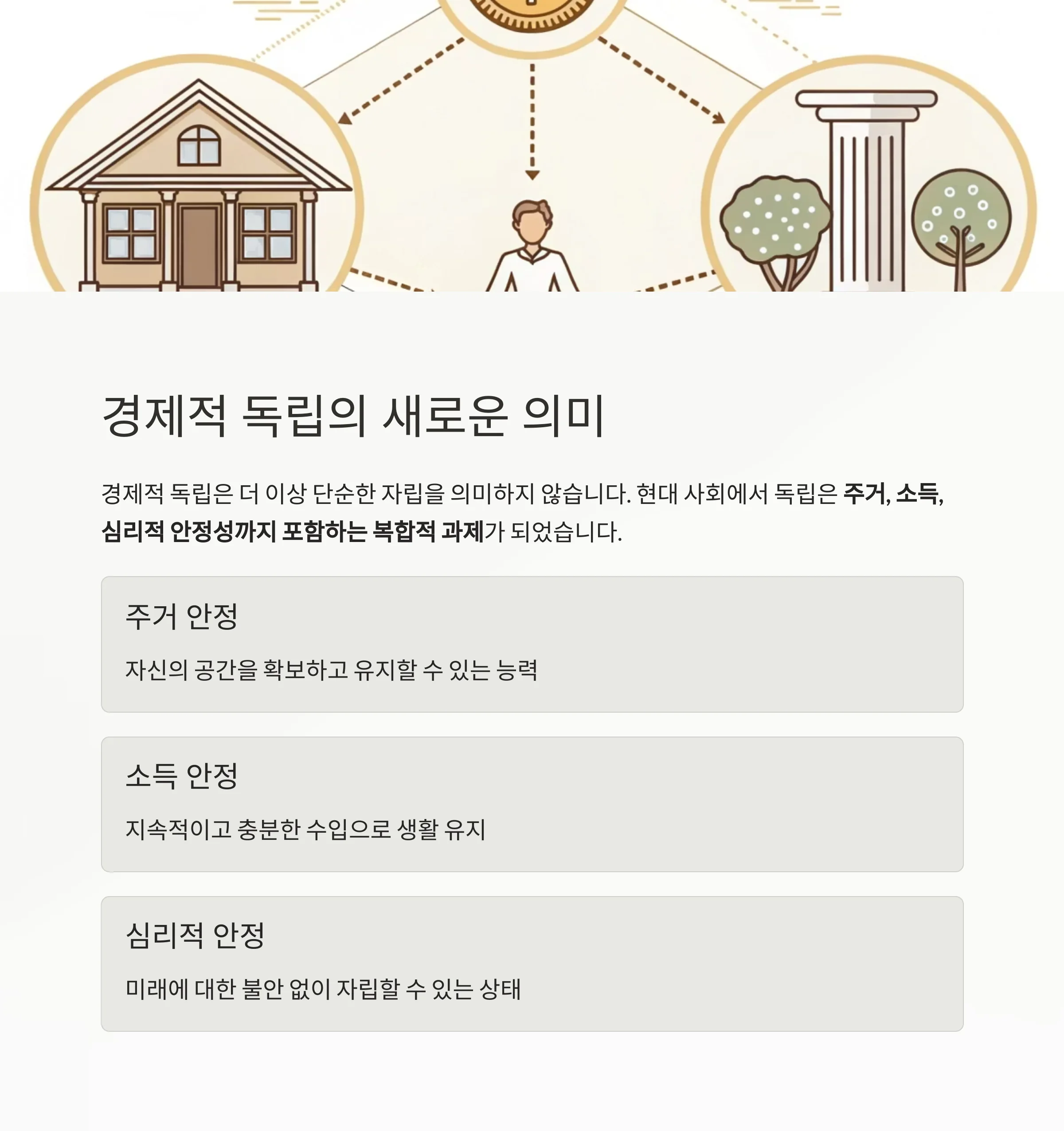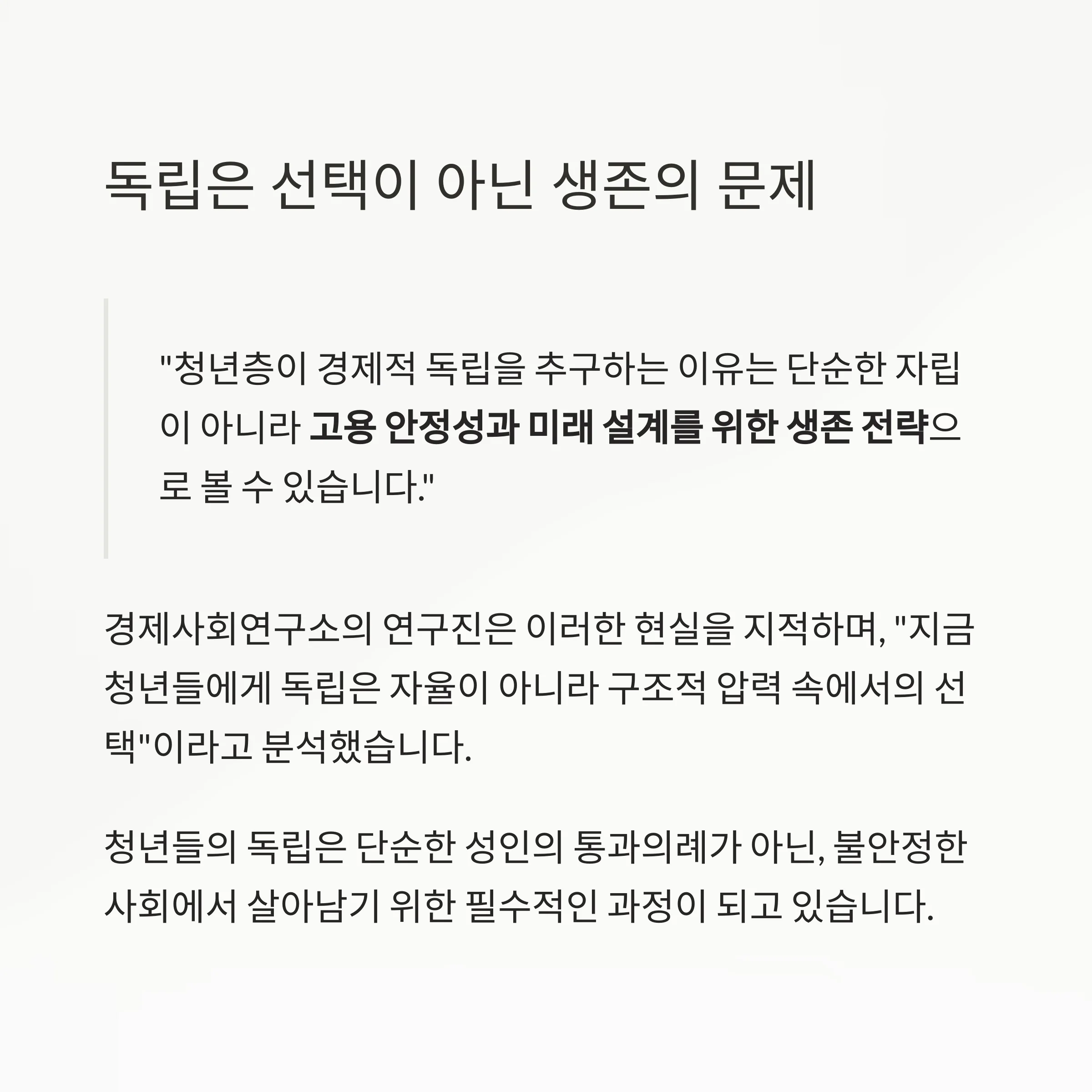 현대 사회에서 독립은 주거, 소득, 심리적 안정성까지 포함하는 복합적 과제가 되었습니다.