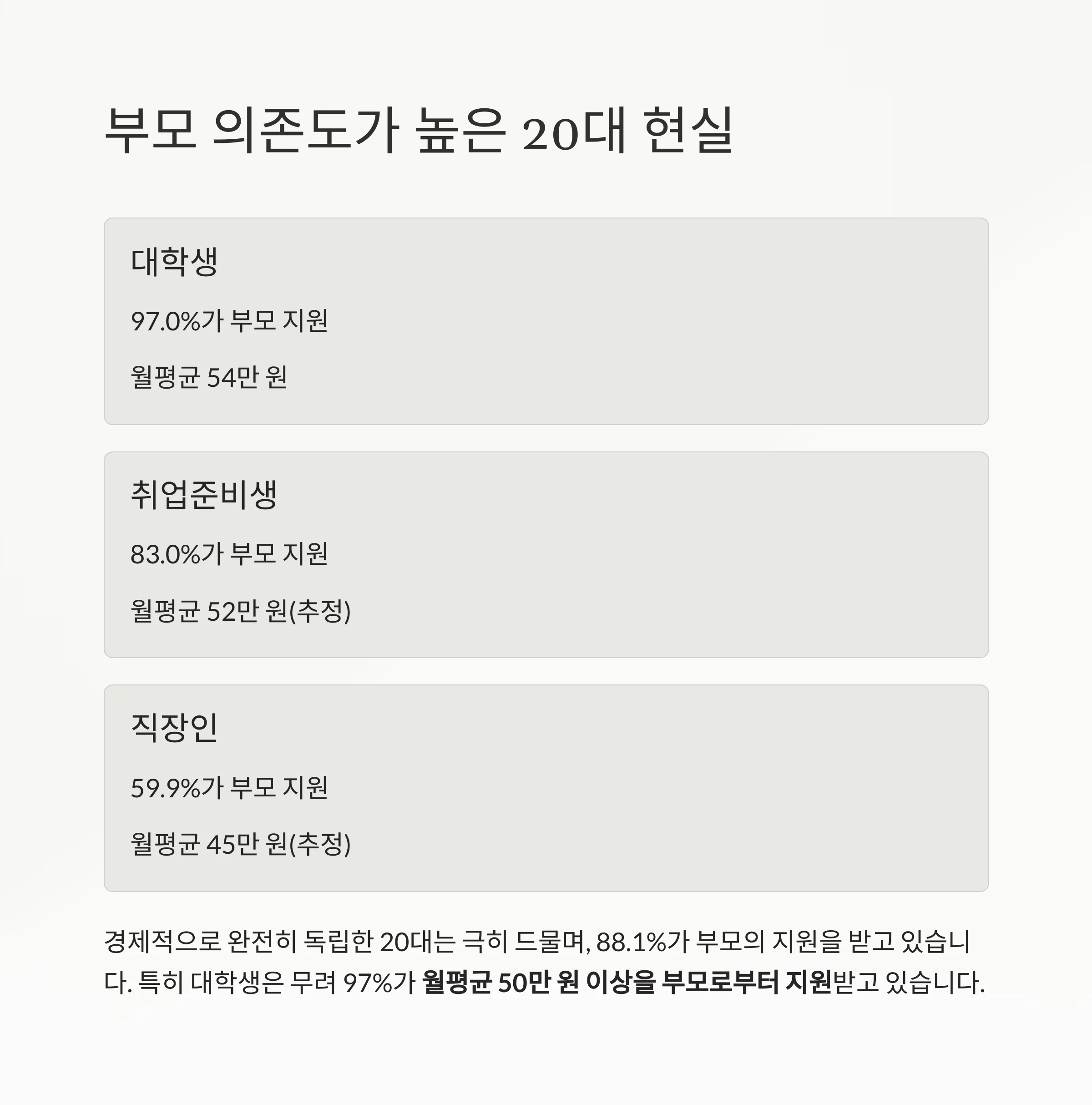 특히 대학생은 무려 97%가 월평균 50만 원 이상을 부모로부터 지원받고 있습니다.