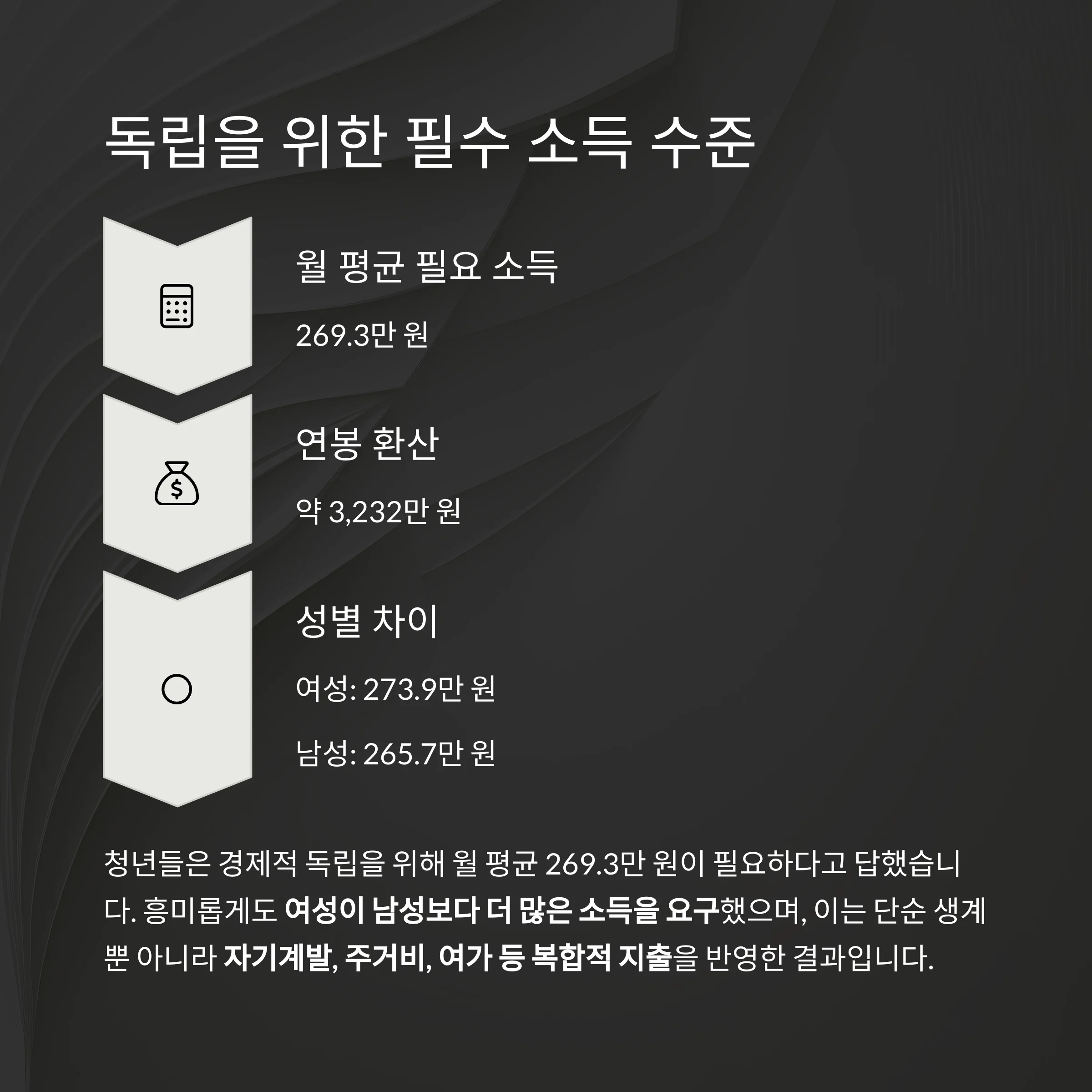 청년들은 경제적 독립을 위해 월 평균 269.3만 원(연봉 약 3,232만 원)이 필요하다고 답했습니다.