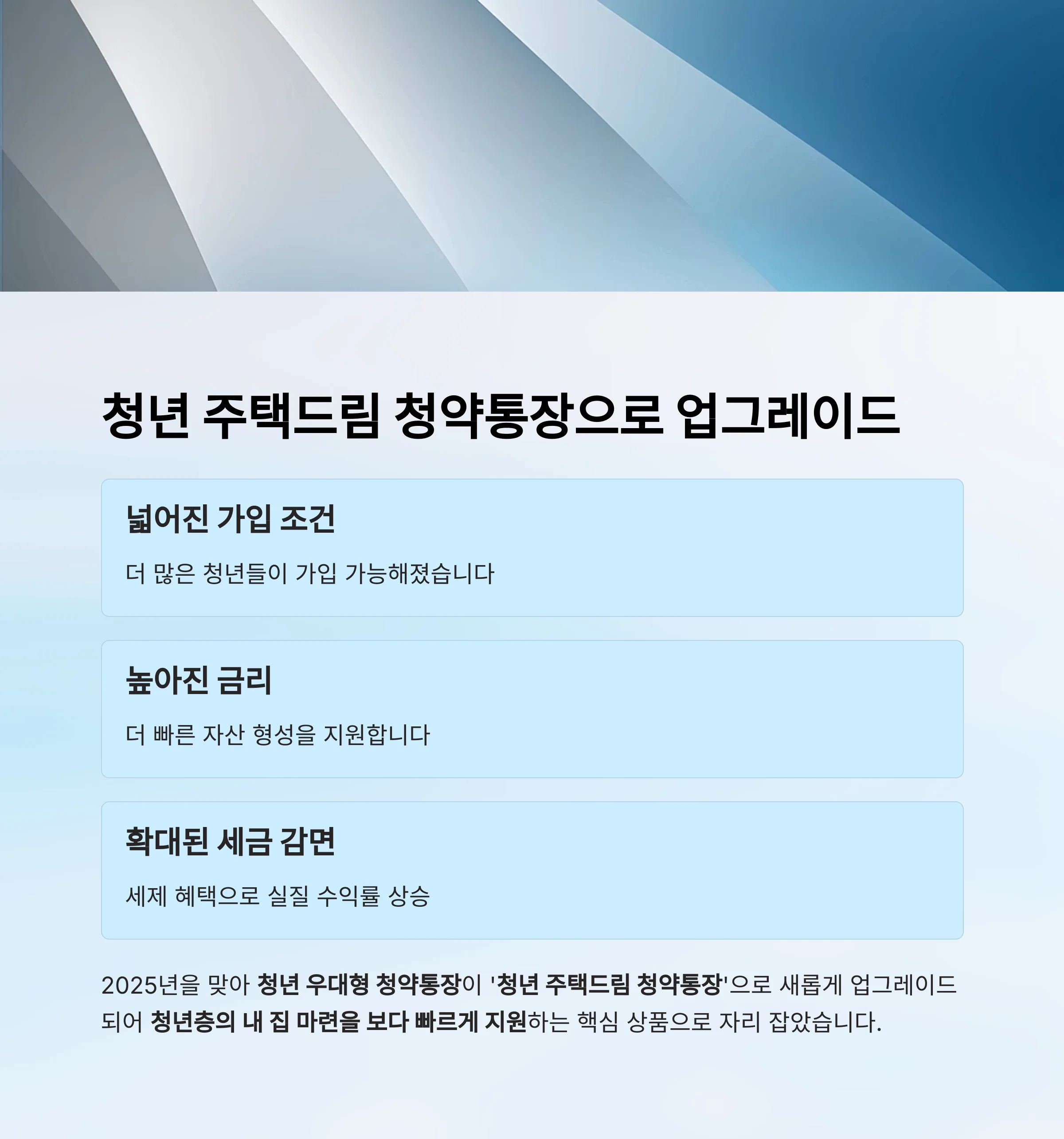 2025년을 맞아 청년 우대형 청약통장이 ‘청년 주택드림 청약통장’으로 새롭게 업그레이드되었습니다.