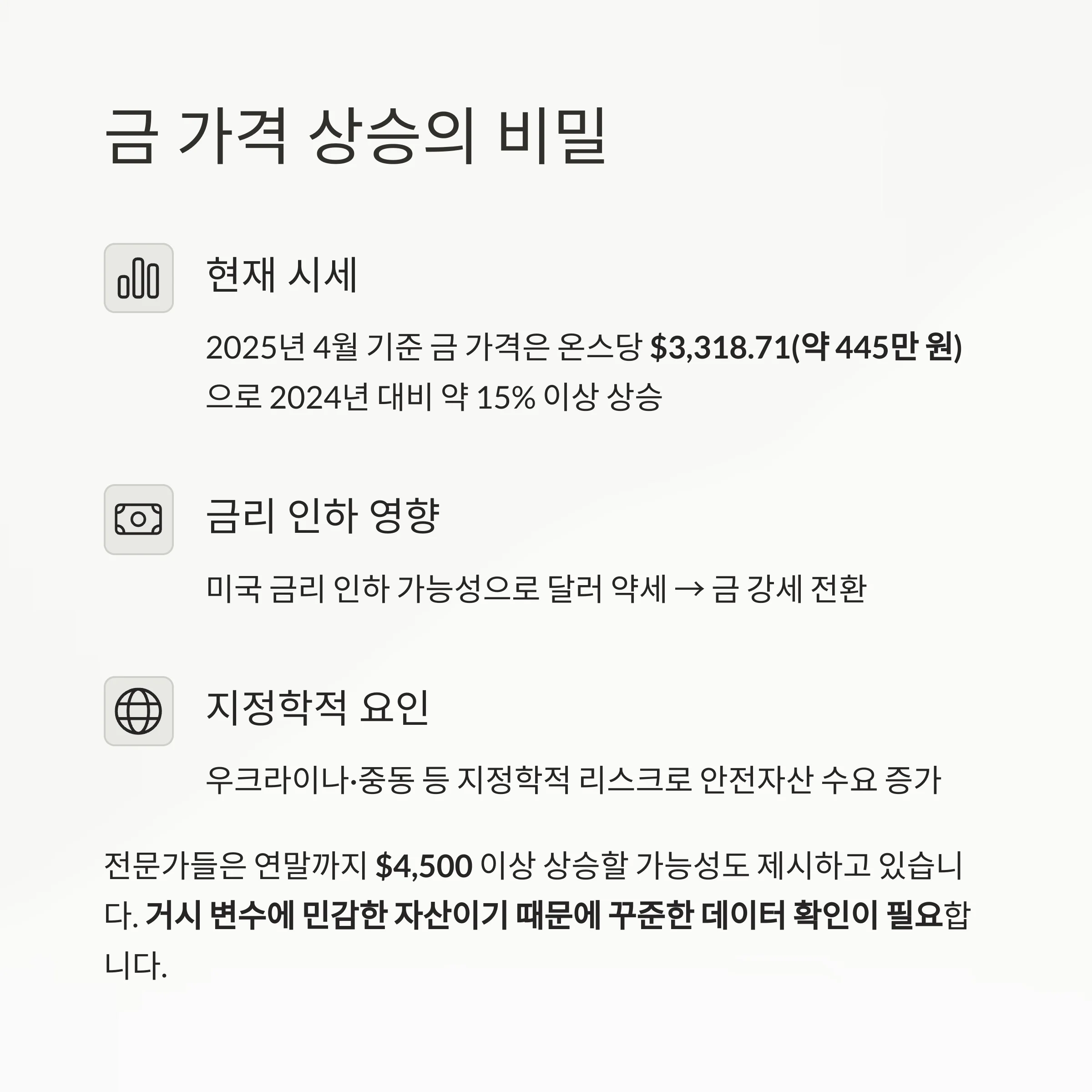 2025년 4월 기준 금 가격은 온스당 **$3,318.71(약 445만 원)**으로