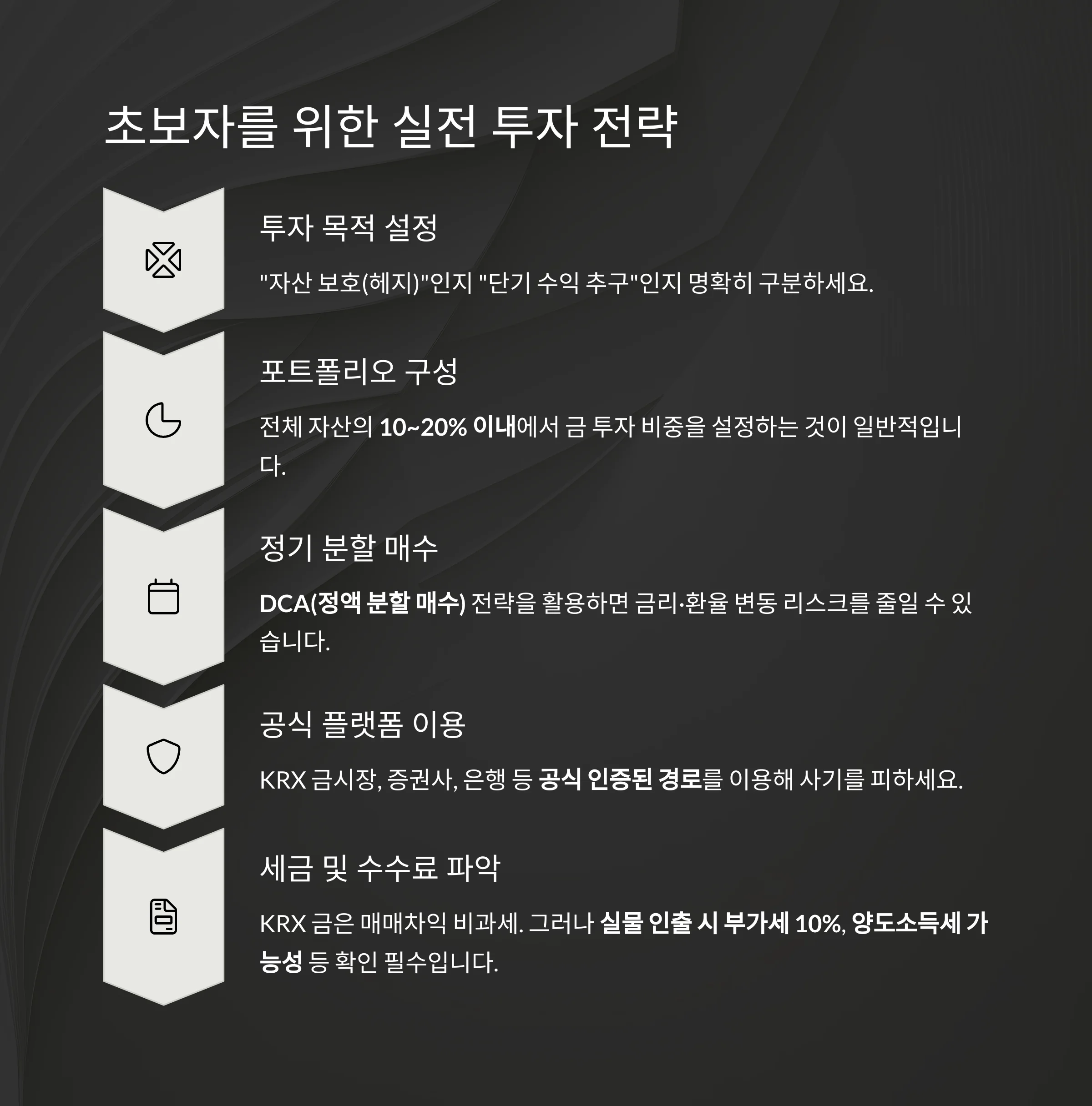 초보자가 금 투자로 성공하려면 단순한 매수·보유가 아닌 전략적인 접근이 필요합니다.