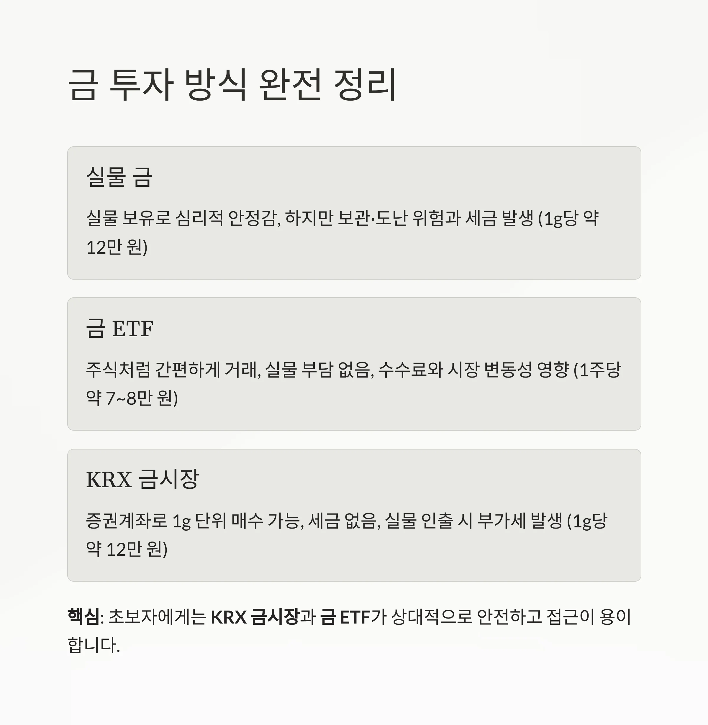 핵심: 초보자에게는 KRX 금시장과 금 ETF가 상대적으로 안전하고 접근이 용이합니다.