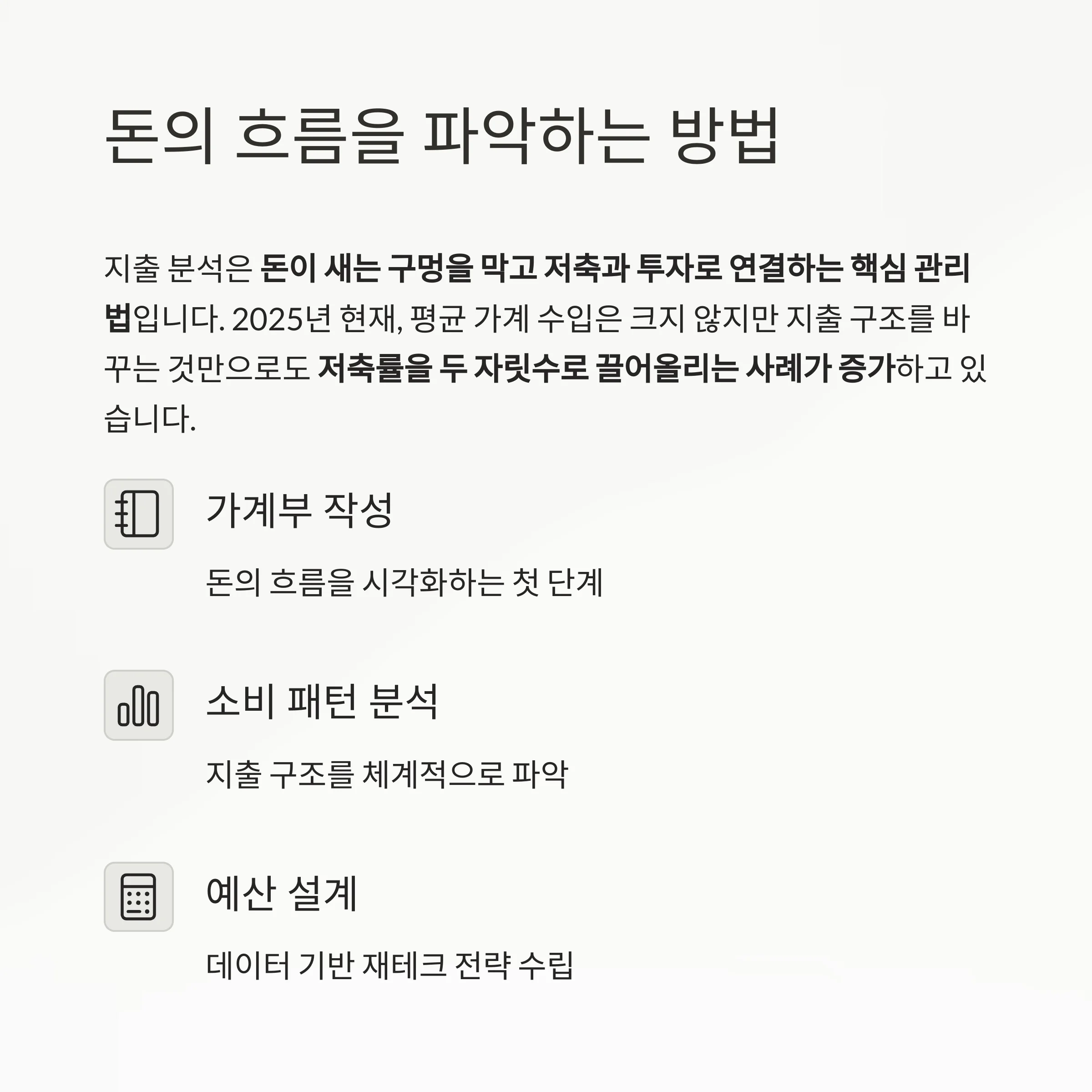 지출 분석은 돈이 새는 구멍을 막고 저축과 투자로 연결하는 핵심 관리법입니다.