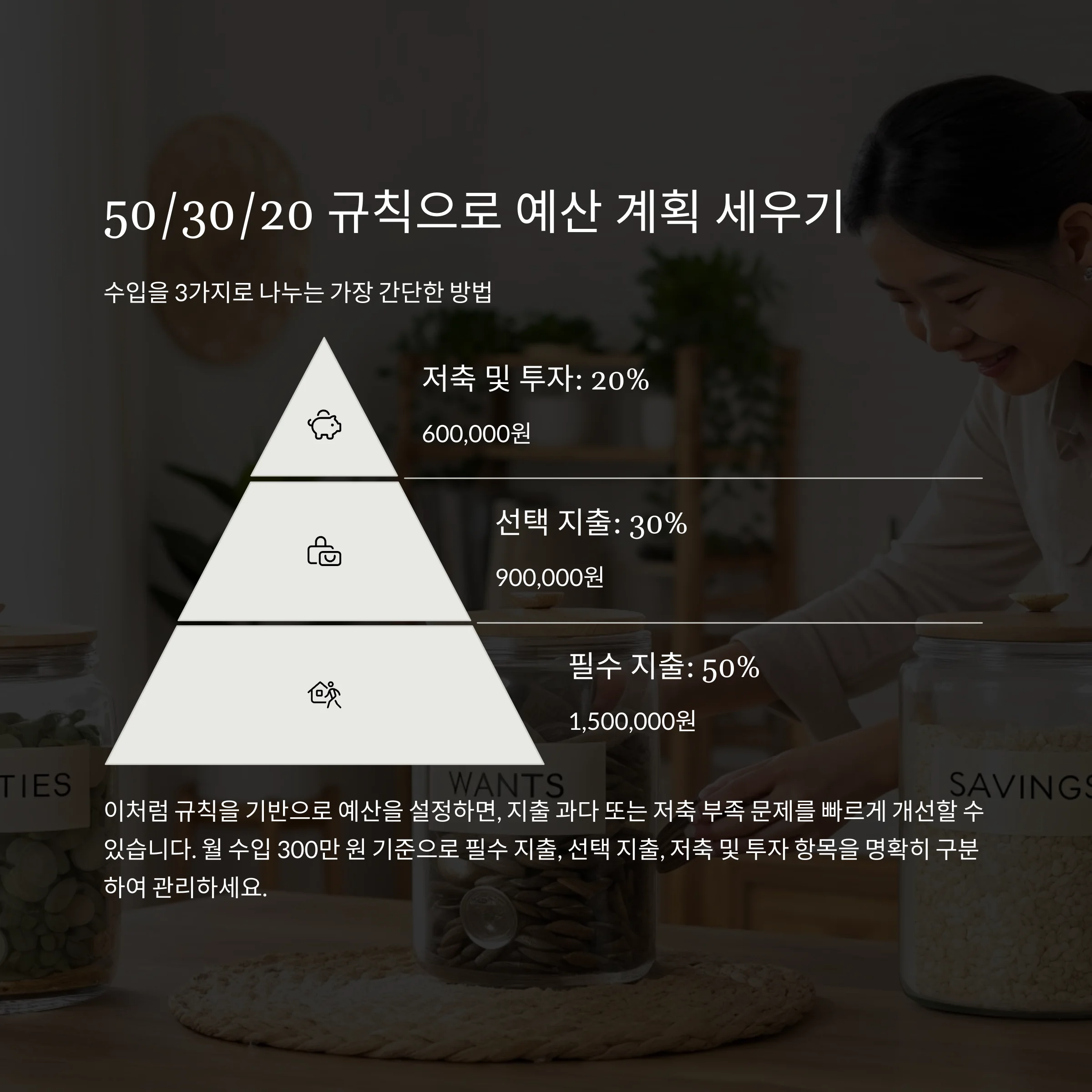 - 필수 지출: 50% (주거, 식비, 교통 등)