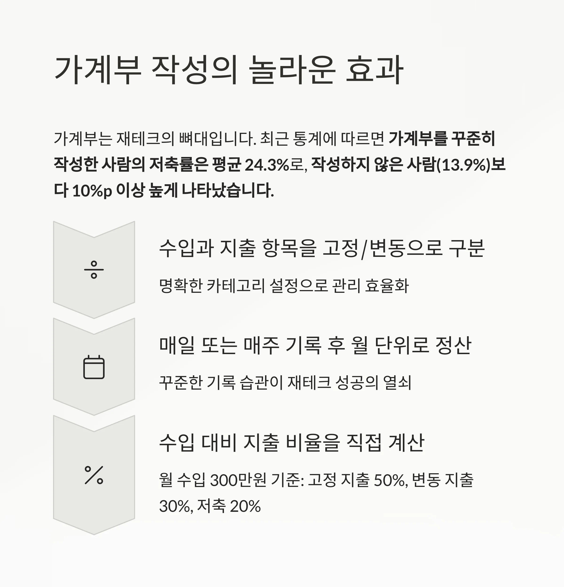 최근 통계에 따르면 **가계부를 꾸준히 작성한 사람의 저축률은 평균 24.3%**로,