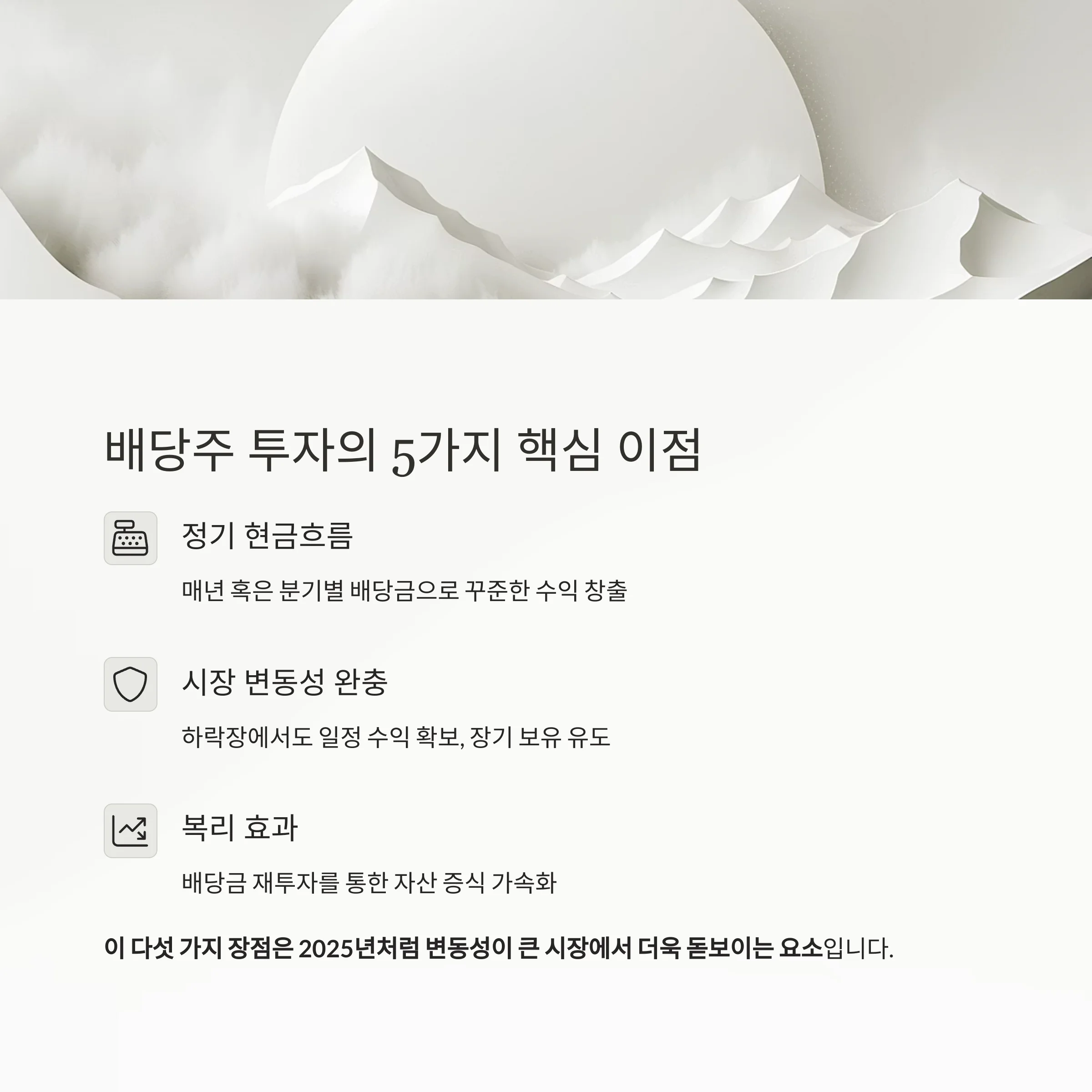 | 정기 현금흐름 | 매년 혹은 분기별 배당금으로 꾸준한 수익 창출 |