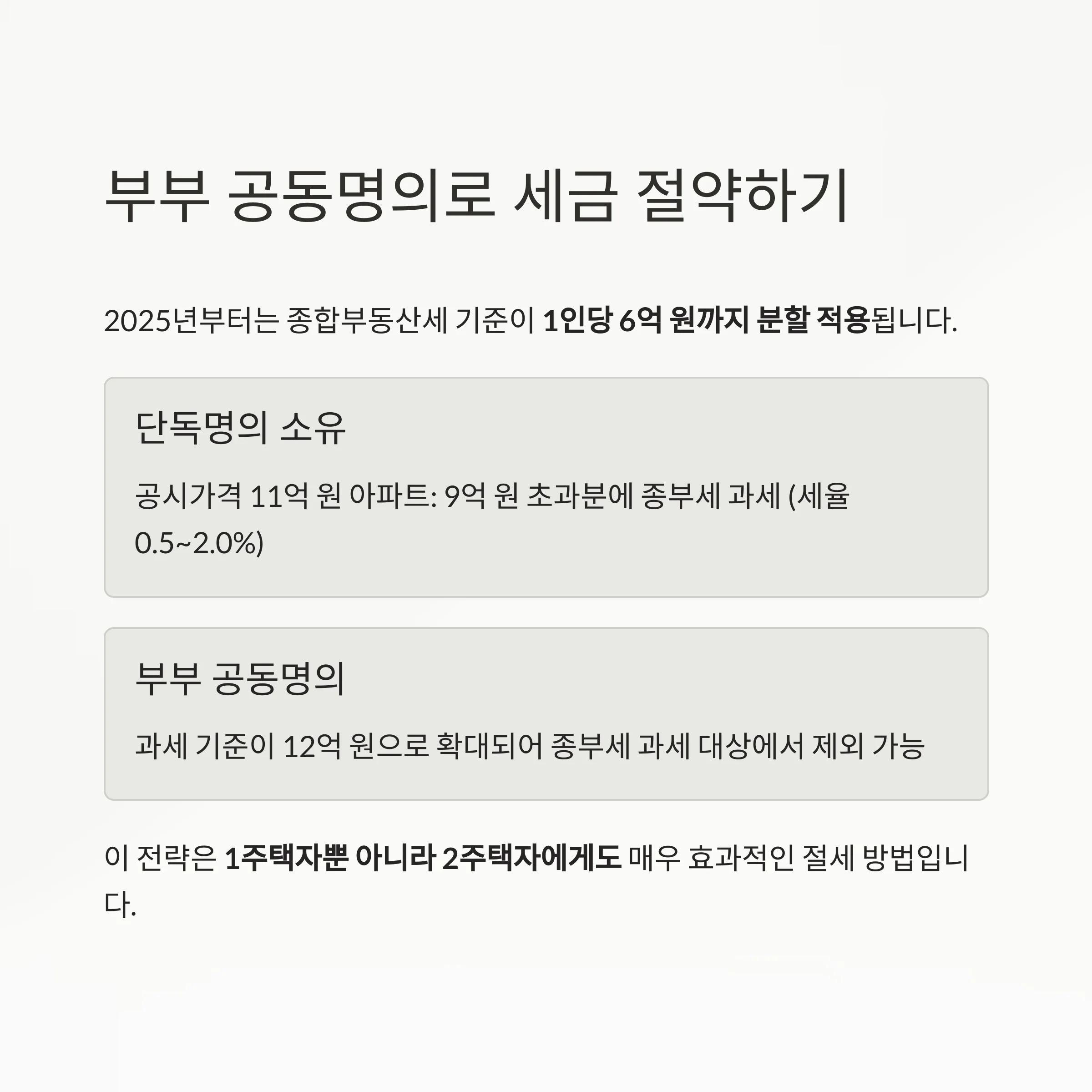 하지만 부부 공동명의로 전환하면 과세 기준이 12억 원으로 확대되어