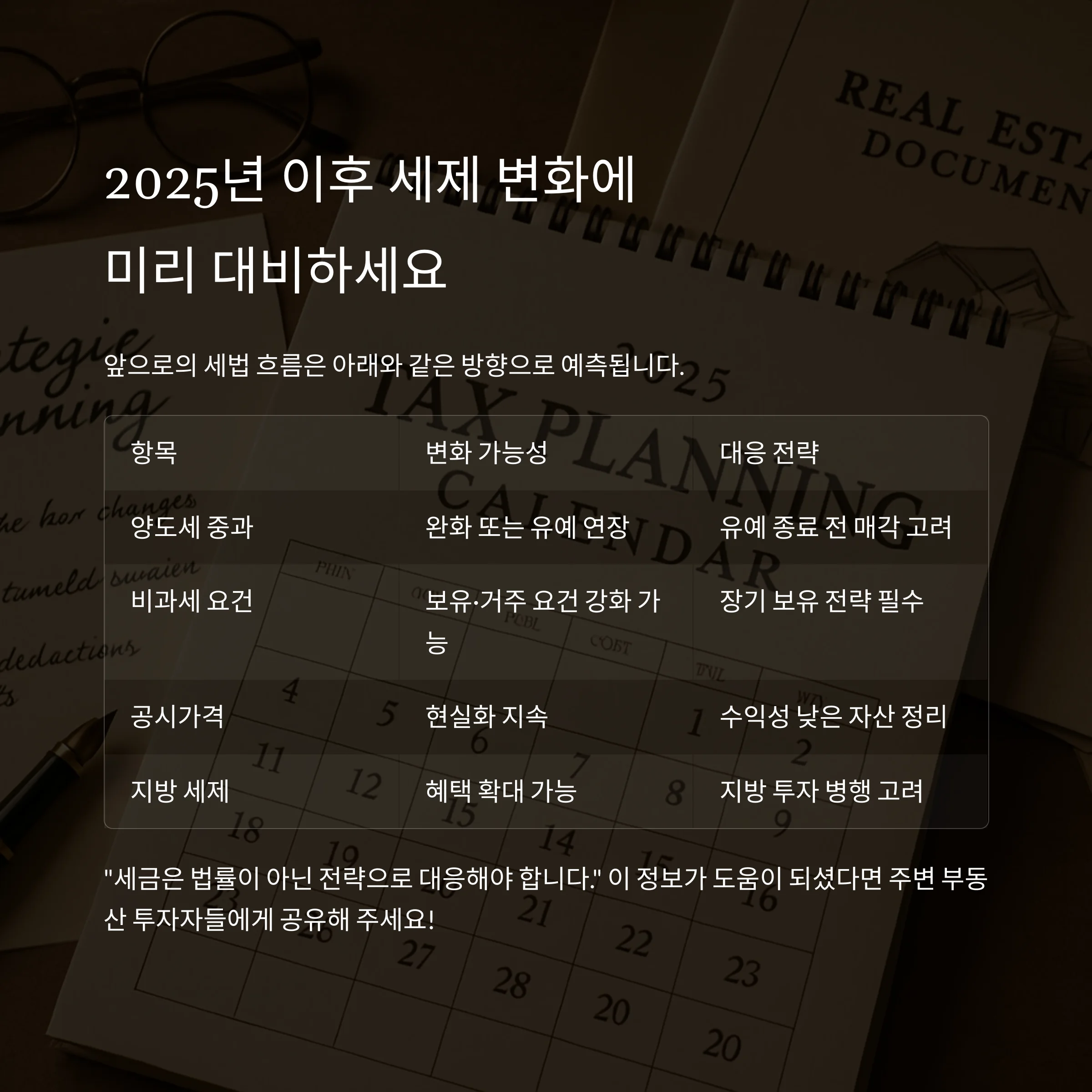 특히 다주택자, 상속·증여 예정자, 1세대 1주택자는 세법 개정 흐름에 따라 맞춤 전략이 필요합니다.