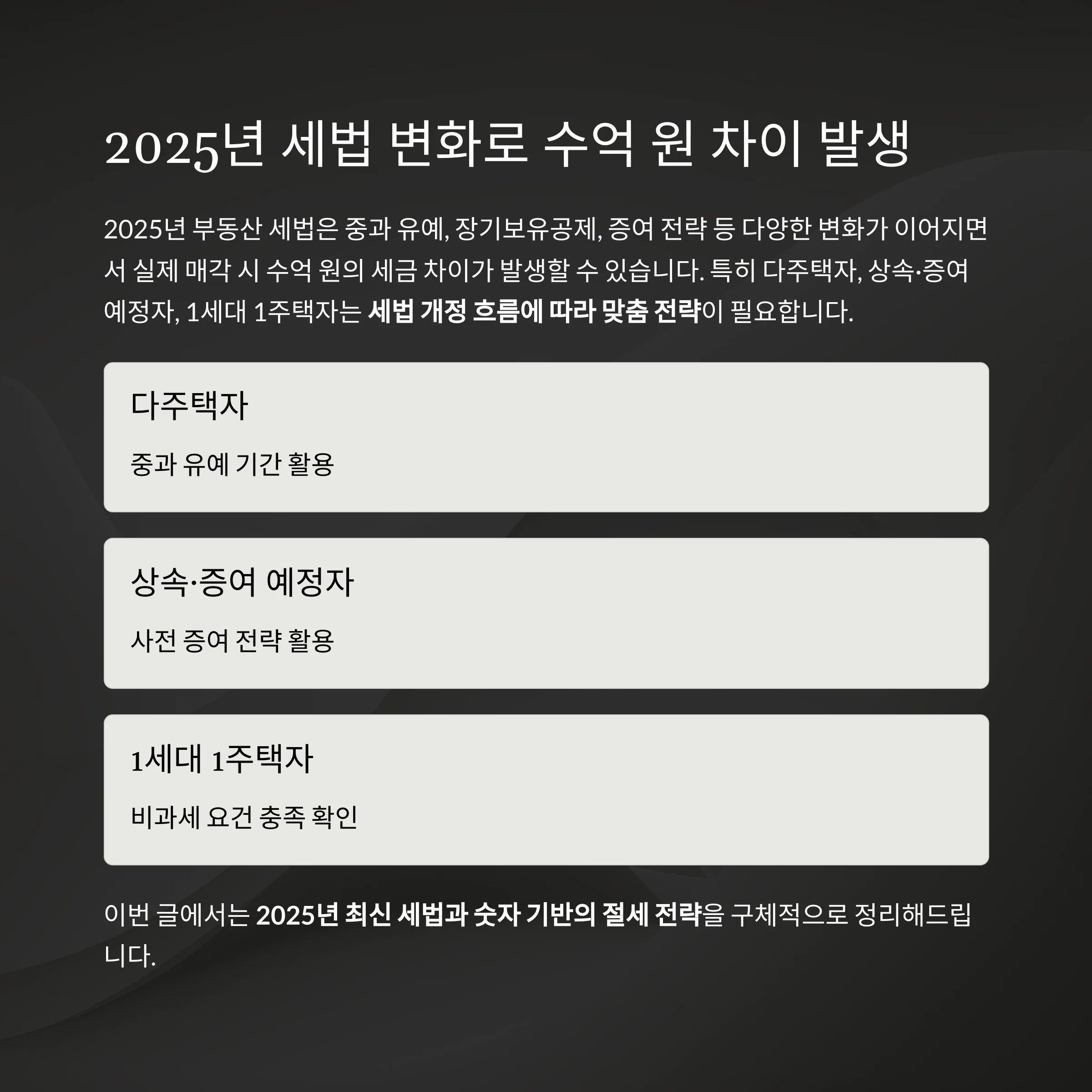 2025년 부동산 세법은 중과 유예, 장기보유공제, 증여 전략 등 다양한 변화가 이어지면서