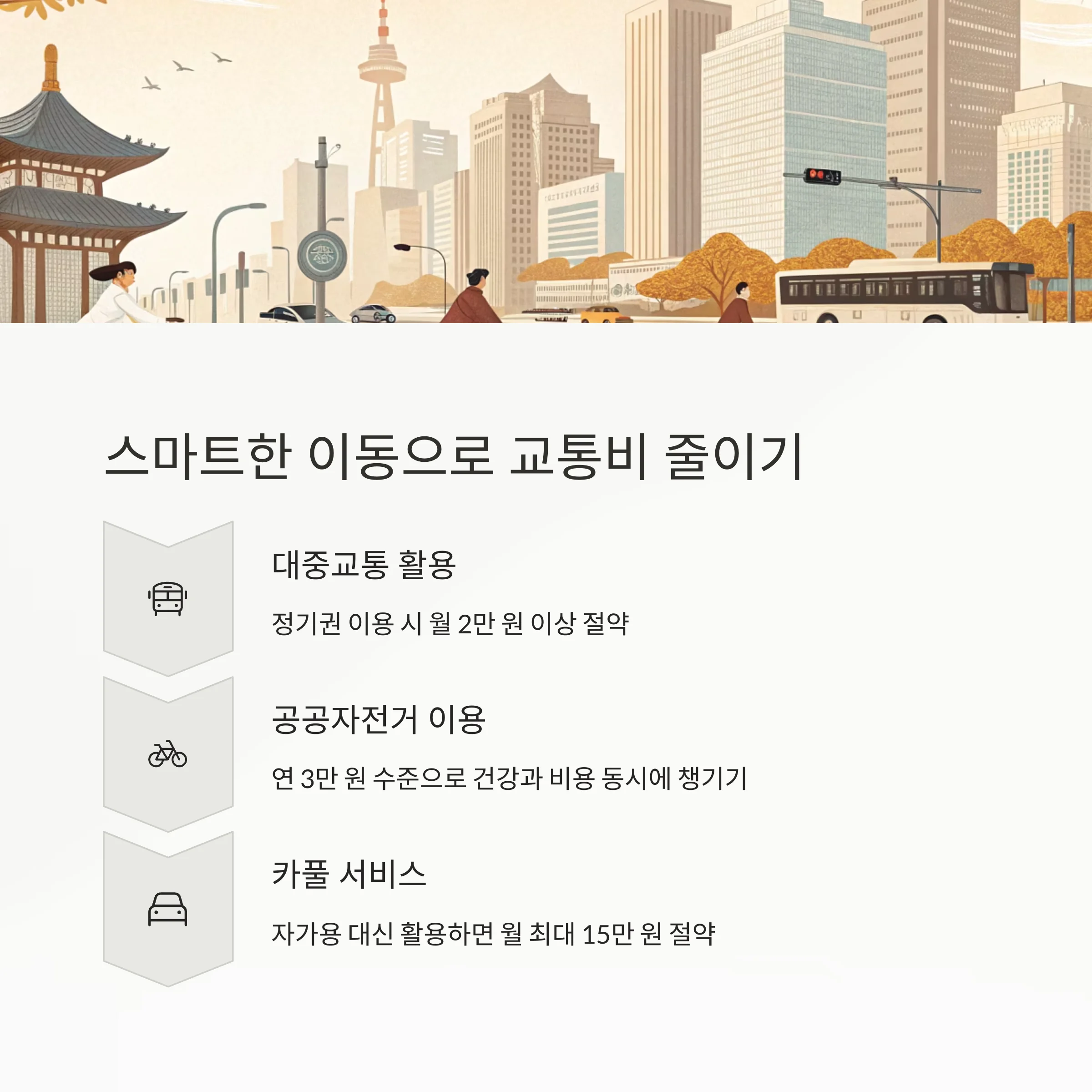 대중교통, 자전거, 카풀을 활용하면 월 최대 15만 원까지 절약 가능합니다.