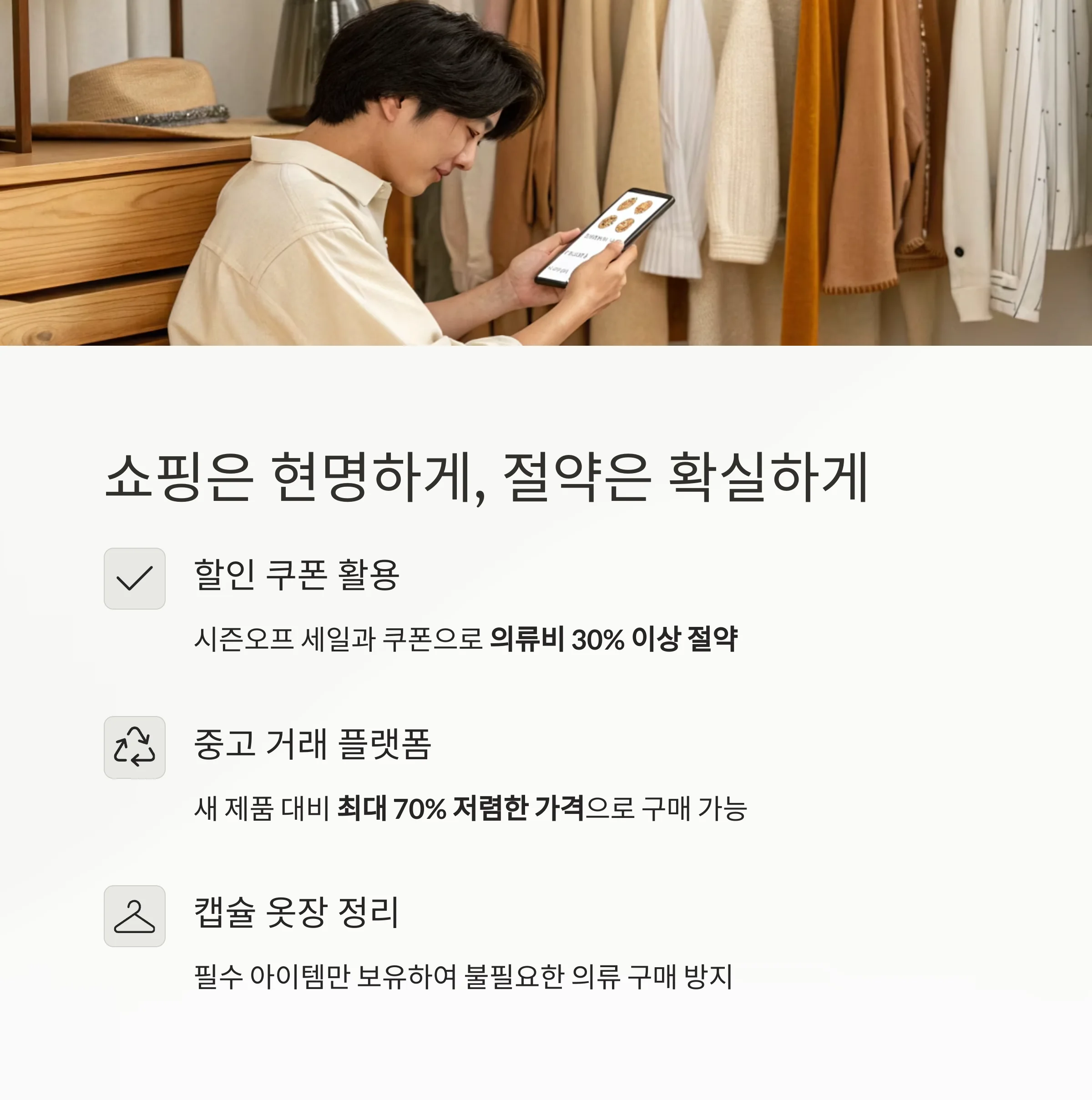 할인 쿠폰, 시즌오프 세일, 캡슐 옷장 정리만 해도 의류비의 30% 이상 절약이 가능합니다.