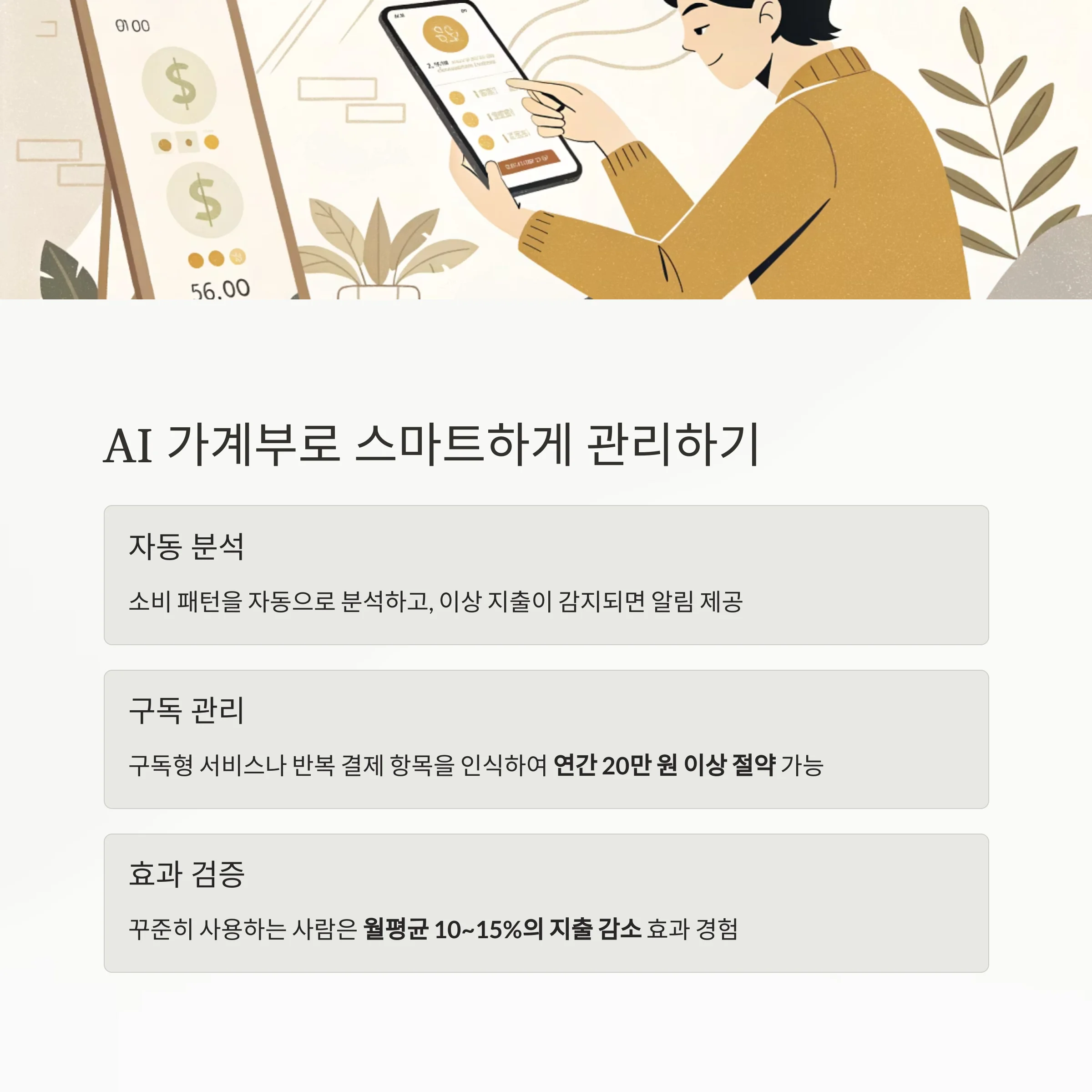 특히 구독형 서비스나 반복 결제 항목을 인식하여, 연간 20만 원 이상 절약이 가능합니다.