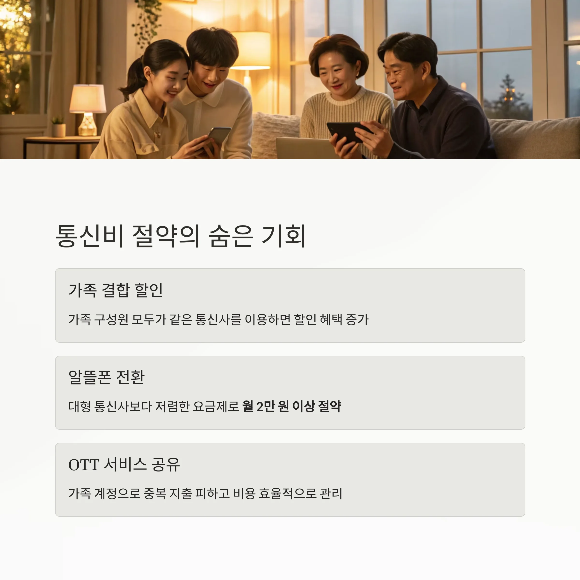 가족 결합 할인, 알뜰폰 요금제로 전환하면 월 2만 원 이상 절약할 수 있습니다.