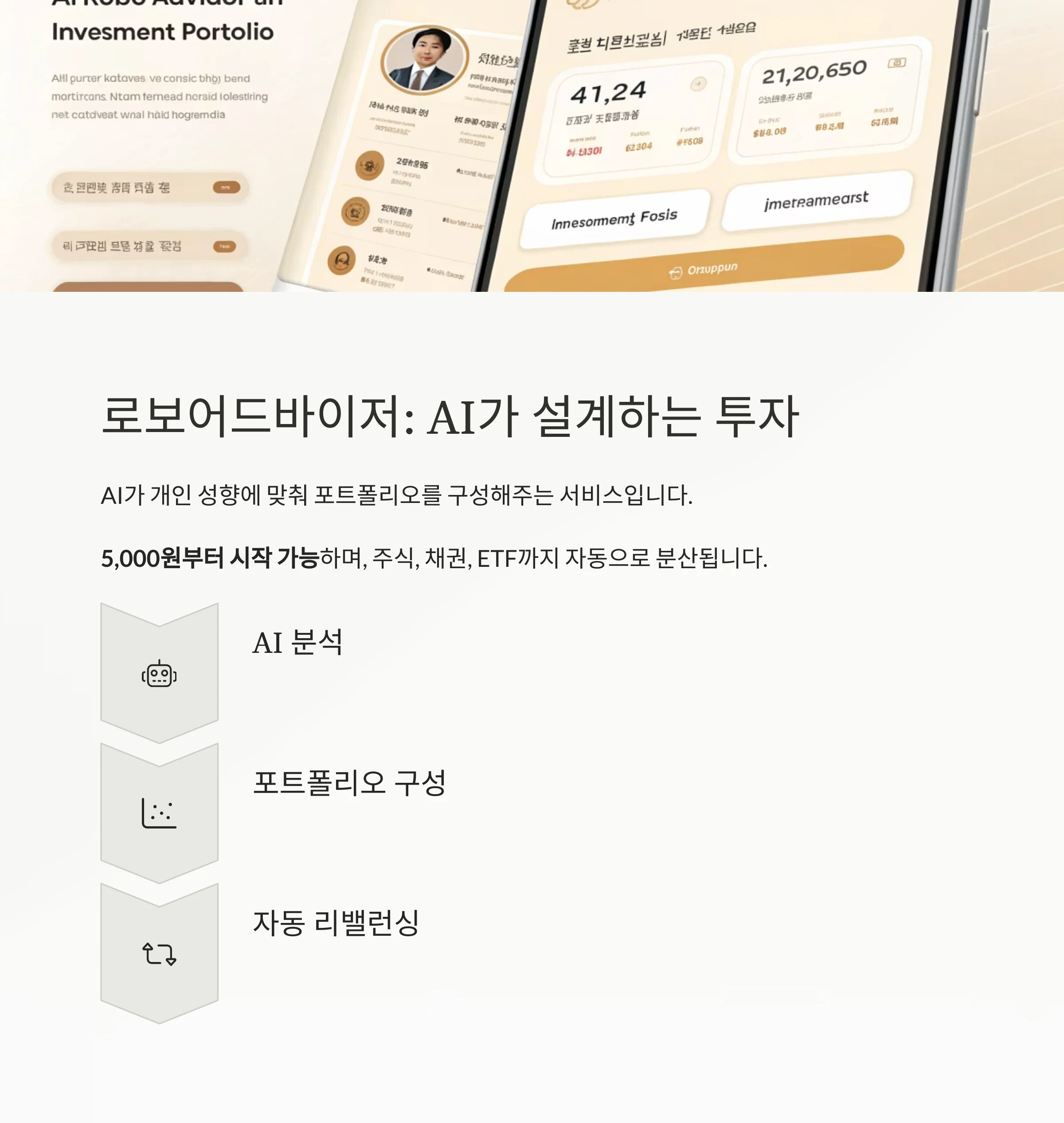 5,000원부터 시작 가능하며, 주식, 채권, ETF까지 자동으로 분산됩니다.