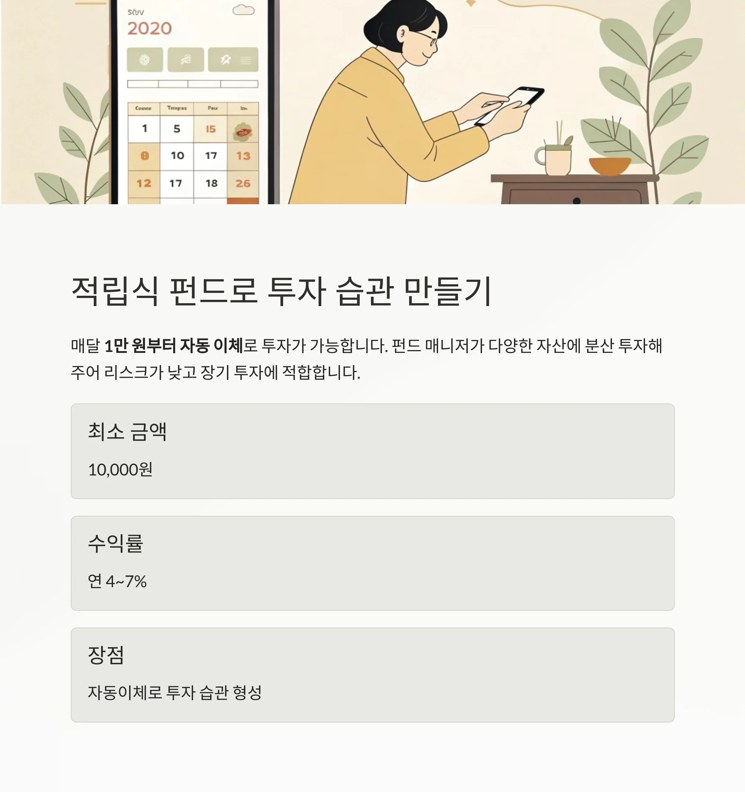 초보자가 고민 없이 시작하기 좋은 투자 방식이며, 연 4~8% 수익률이 기대됩니다.