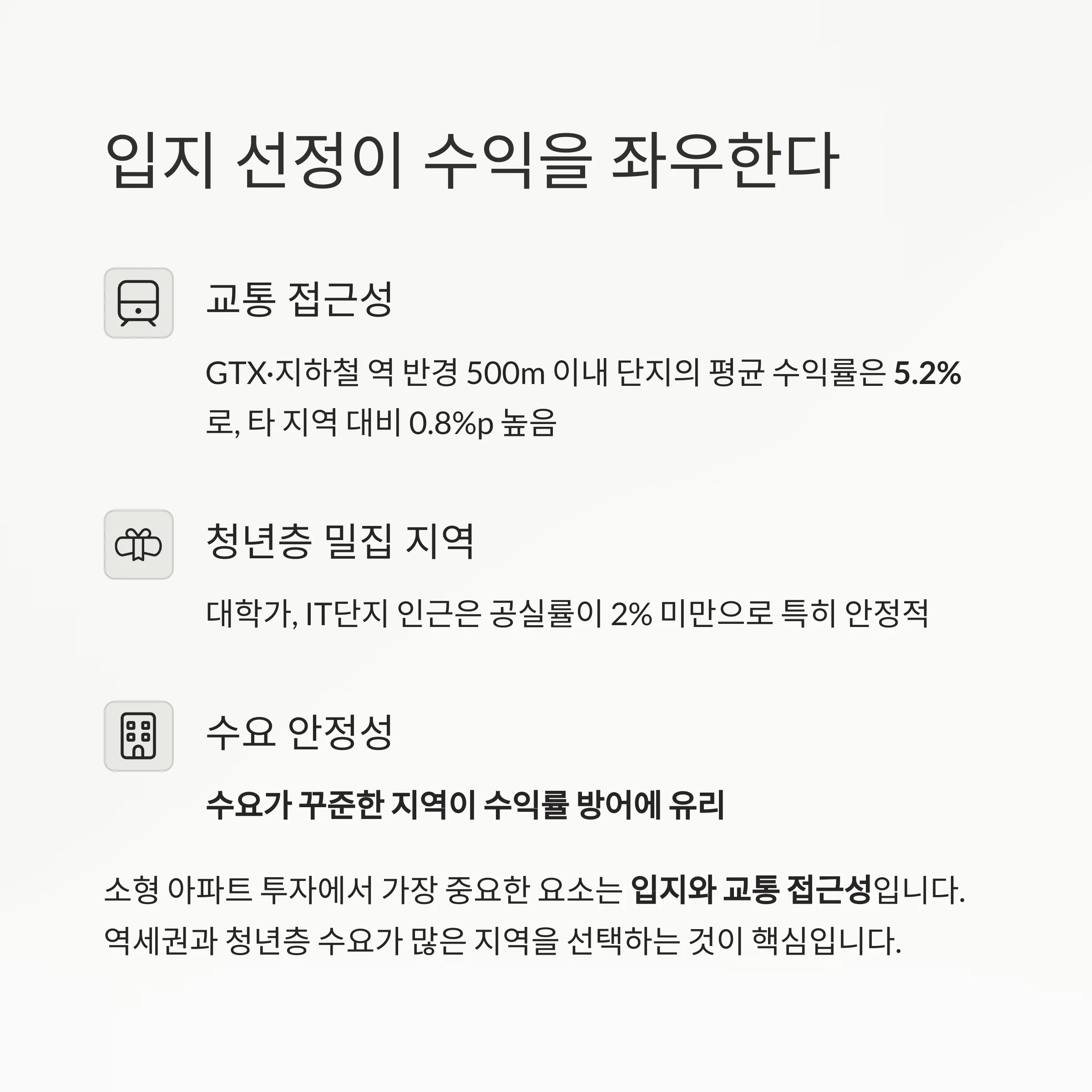 소형 아파트 투자에서 가장 중요한 요소는 입지와 교통 접근성입니다.