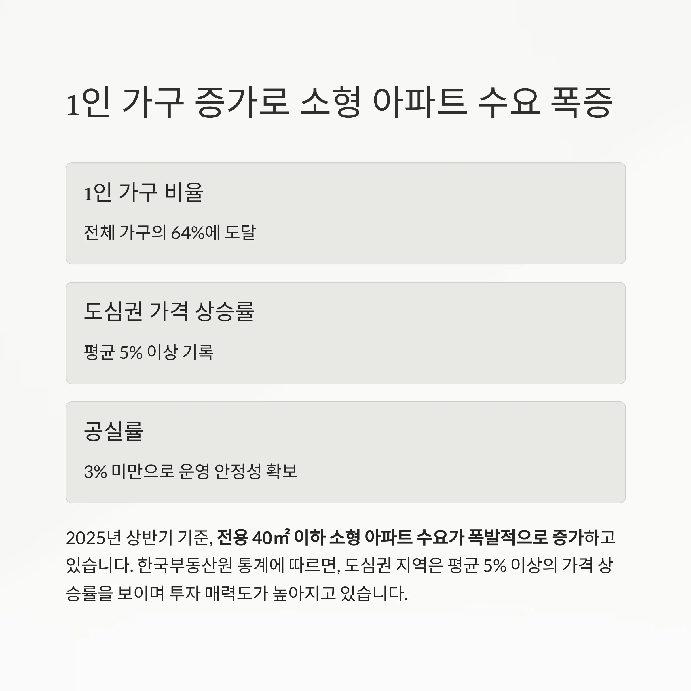 2025년 현재 1인 가구 증가로 인해 소형 아파트에 대한 수요가 급증하고 있습니다.