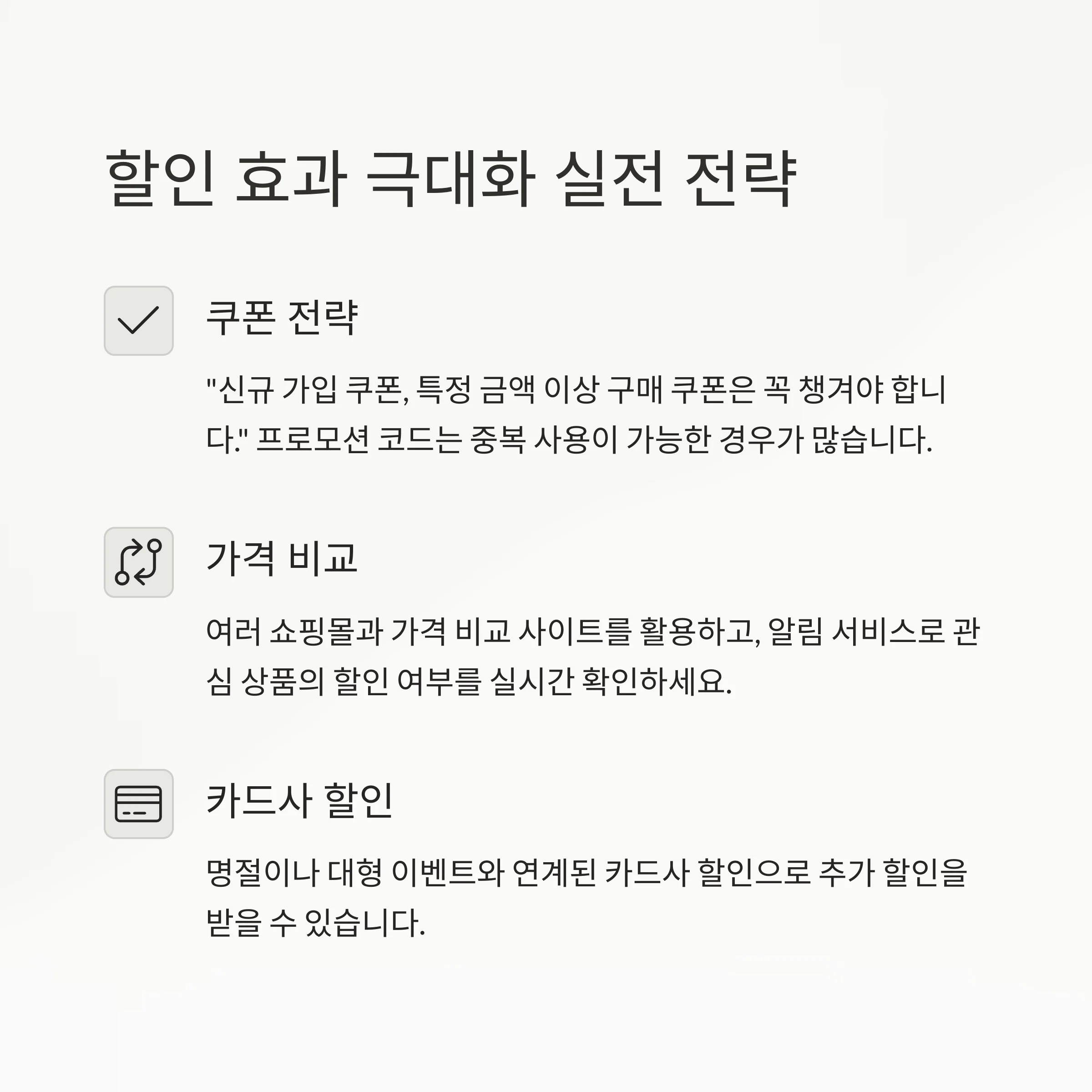할인 타이밍 외에도 몇 가지 핵심 전략을 병행하면 할인 효과를 극대화할 수 있습니다.