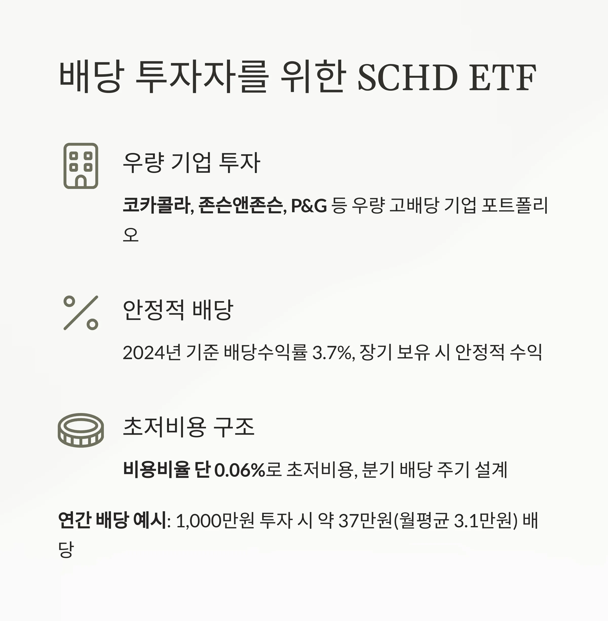 SCHD | 고배당 우량주 | - | 0.06 | 3.7 | 분기 | 안정 배당, 저비용 |