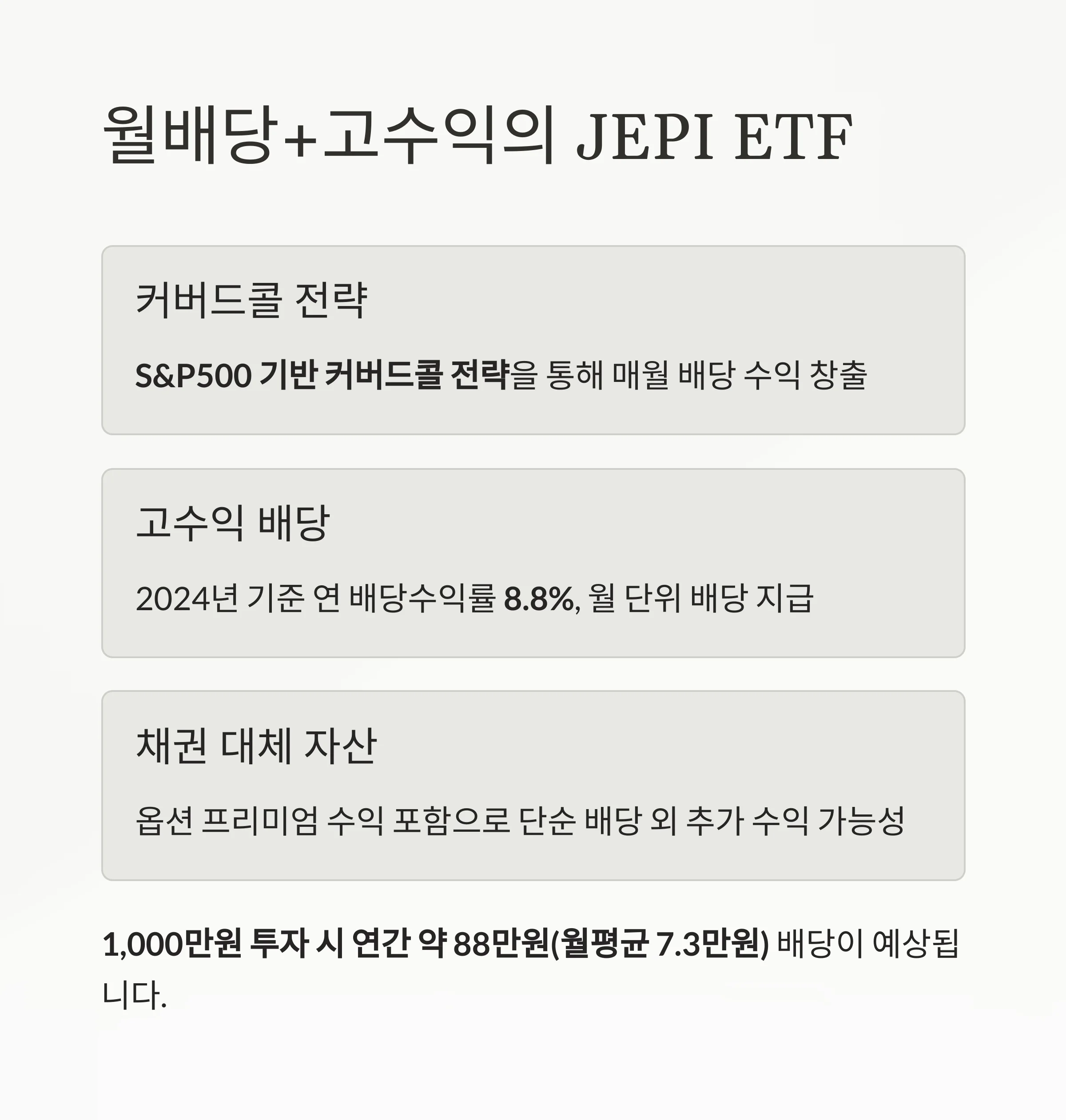 JEPI | 커버드콜 전략 | - | 0.35 | 8.8 | 월 | 고배당, 월배당, 대체자산 |