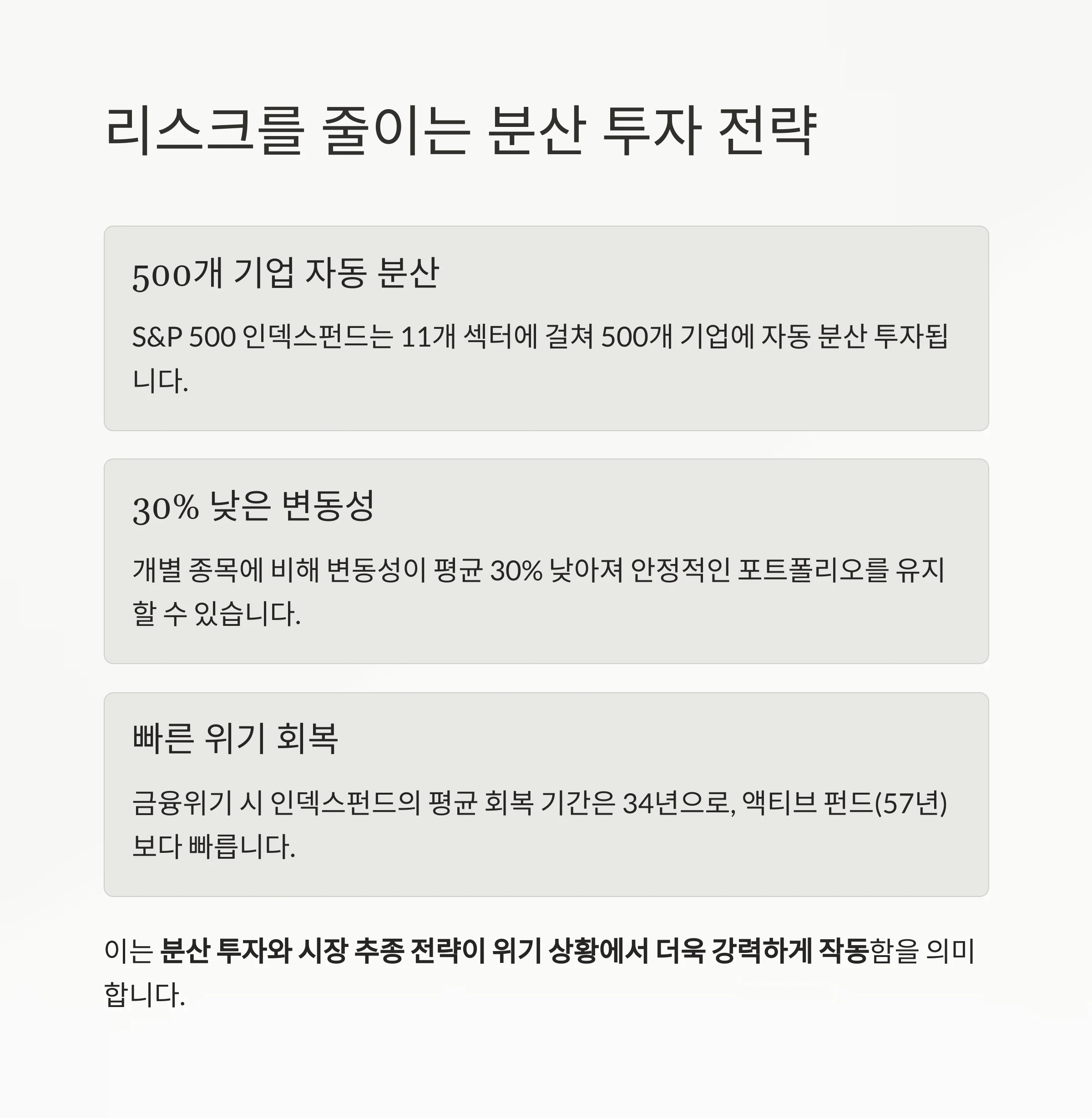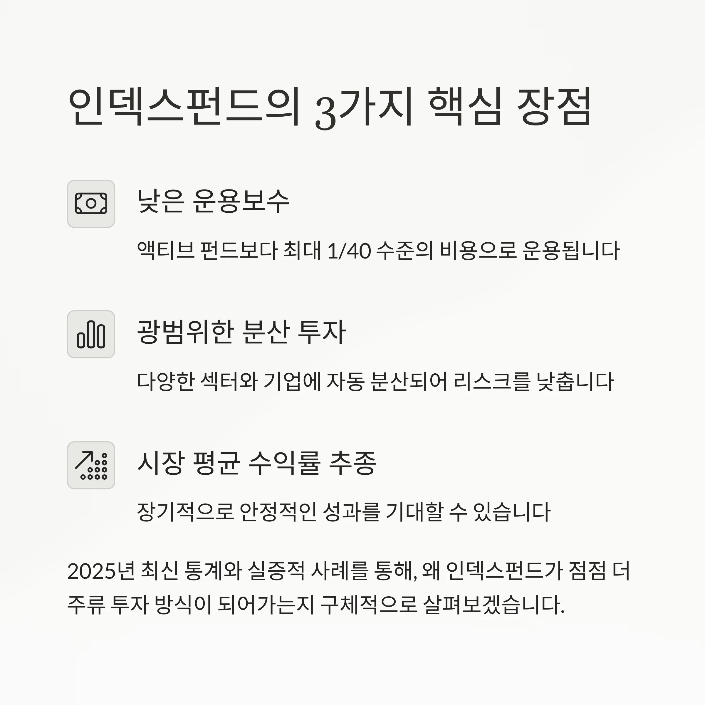 인덱스펀드는 낮은 운용보수, 광범위한 분산 투자, 시장 평균 수익률 추종이라는 구조 덕분에