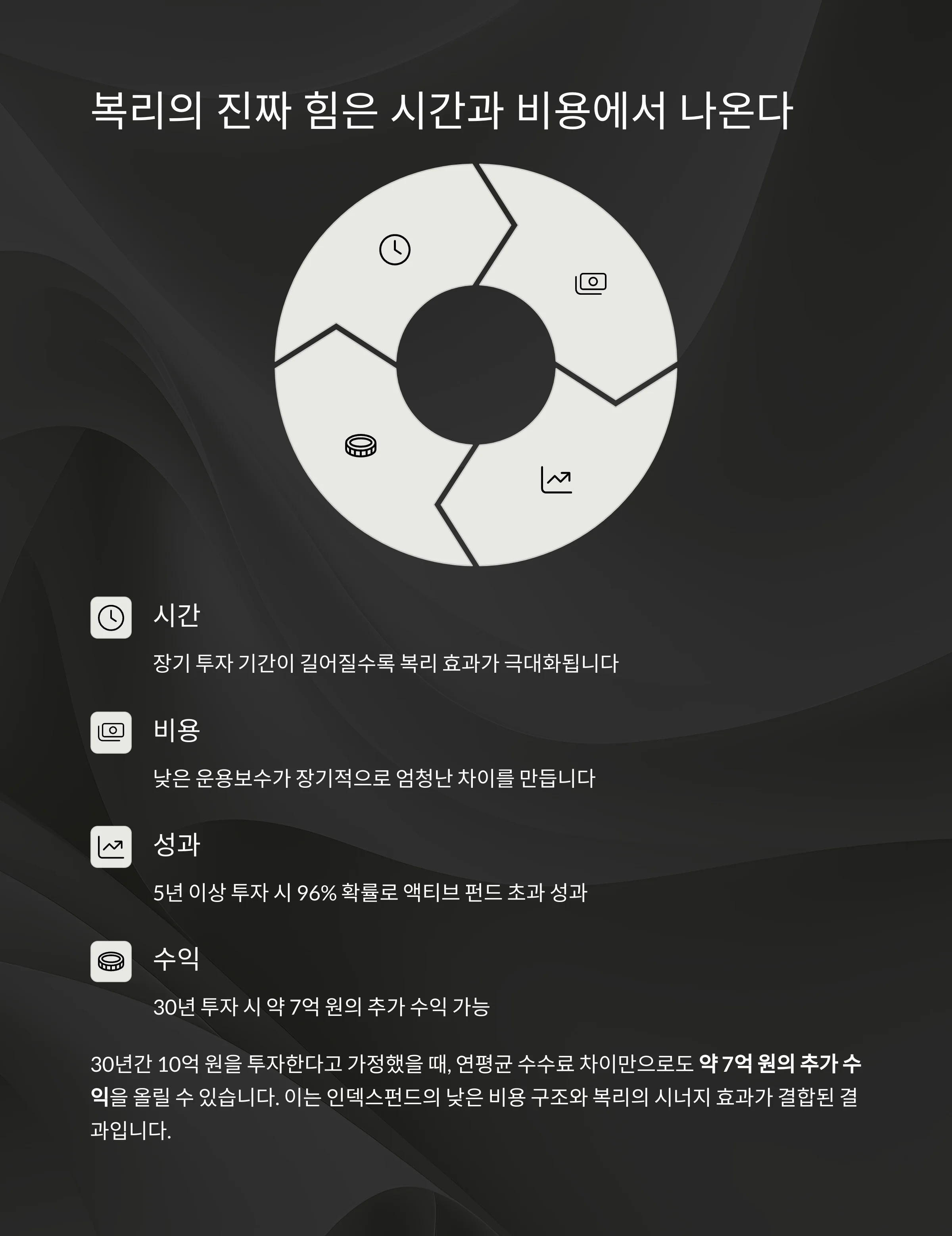 이는 인덱스펀드의 낮은 비용 구조와 복리의 시너지 효과가 결합된 결과입니다.