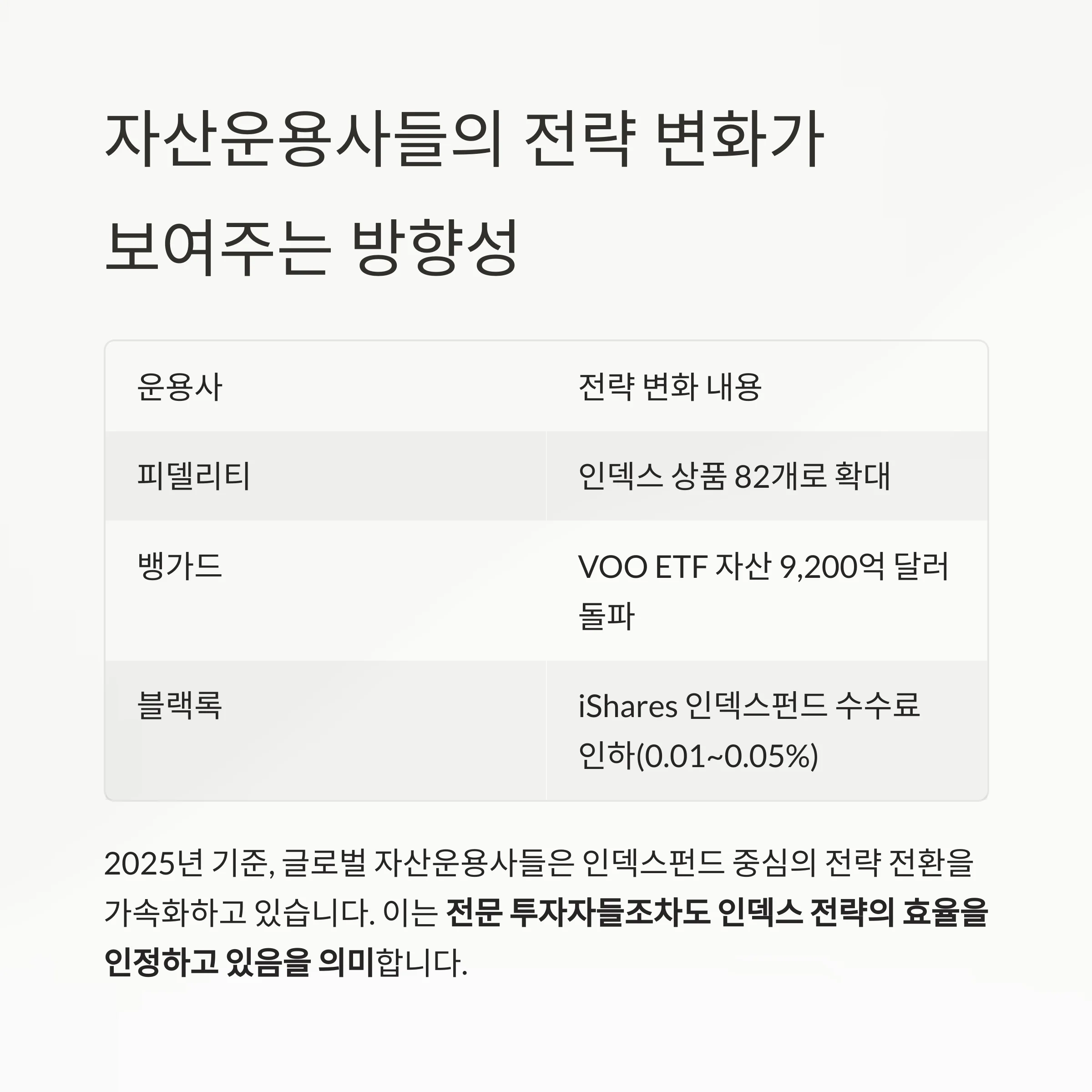 2025년 기준, 글로벌 자산운용사들은 인덱스펀드 중심의 전략 전환을 가속화하고 있습니다.