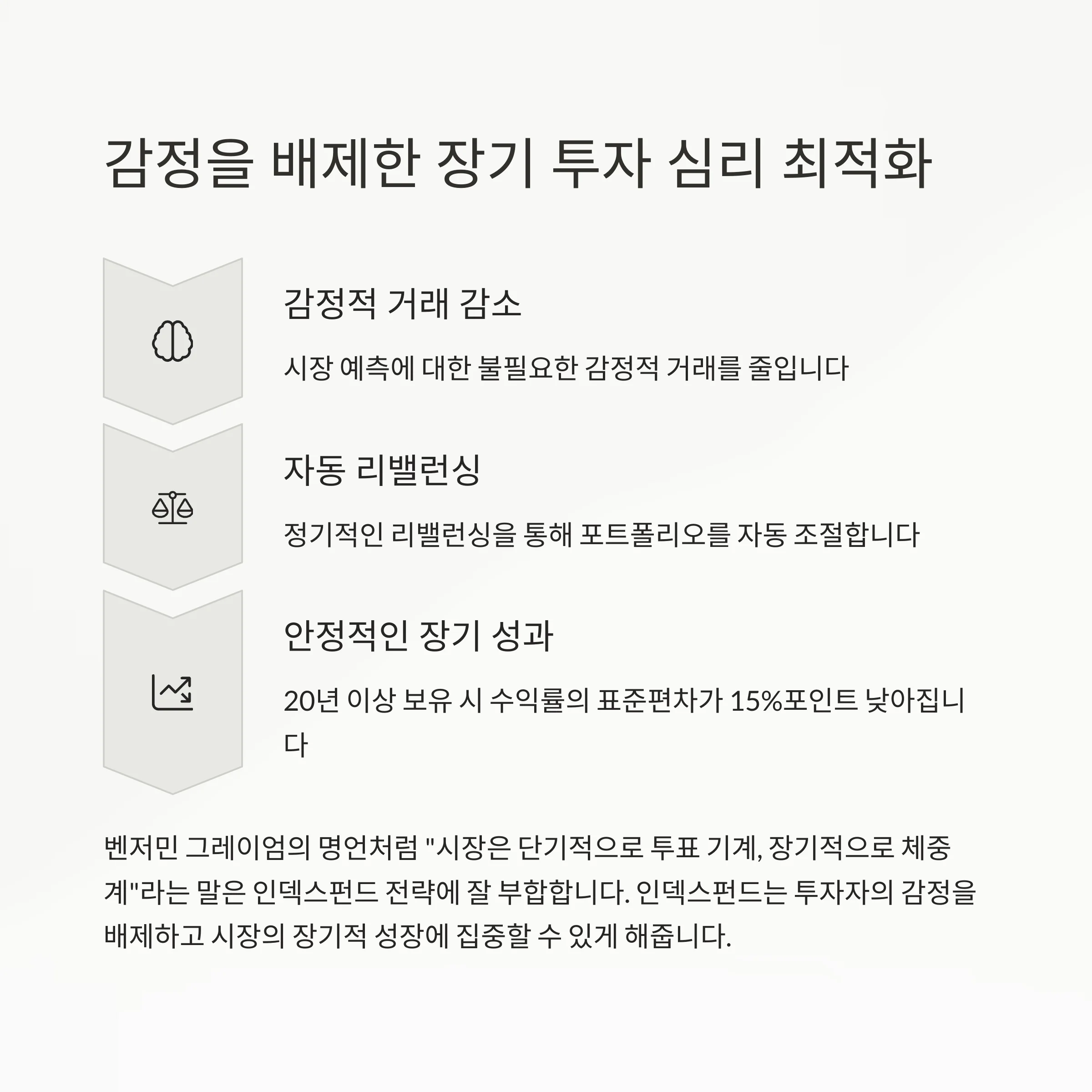 시장 예측에 대한 불필요한 감정적 거래를 줄이고, 리밸런싱을 통한 자동 조절로 투자 스트레스를 낮춥니다.