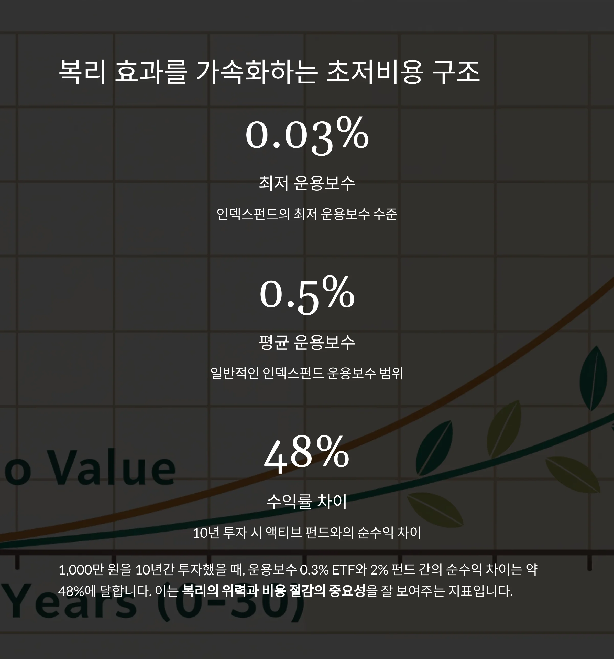 이는 액티브 펀드의 1~2%와 비교해 최대 1/40 수준의 비용으로, 장기 복리의 효율을 극대화합니다.