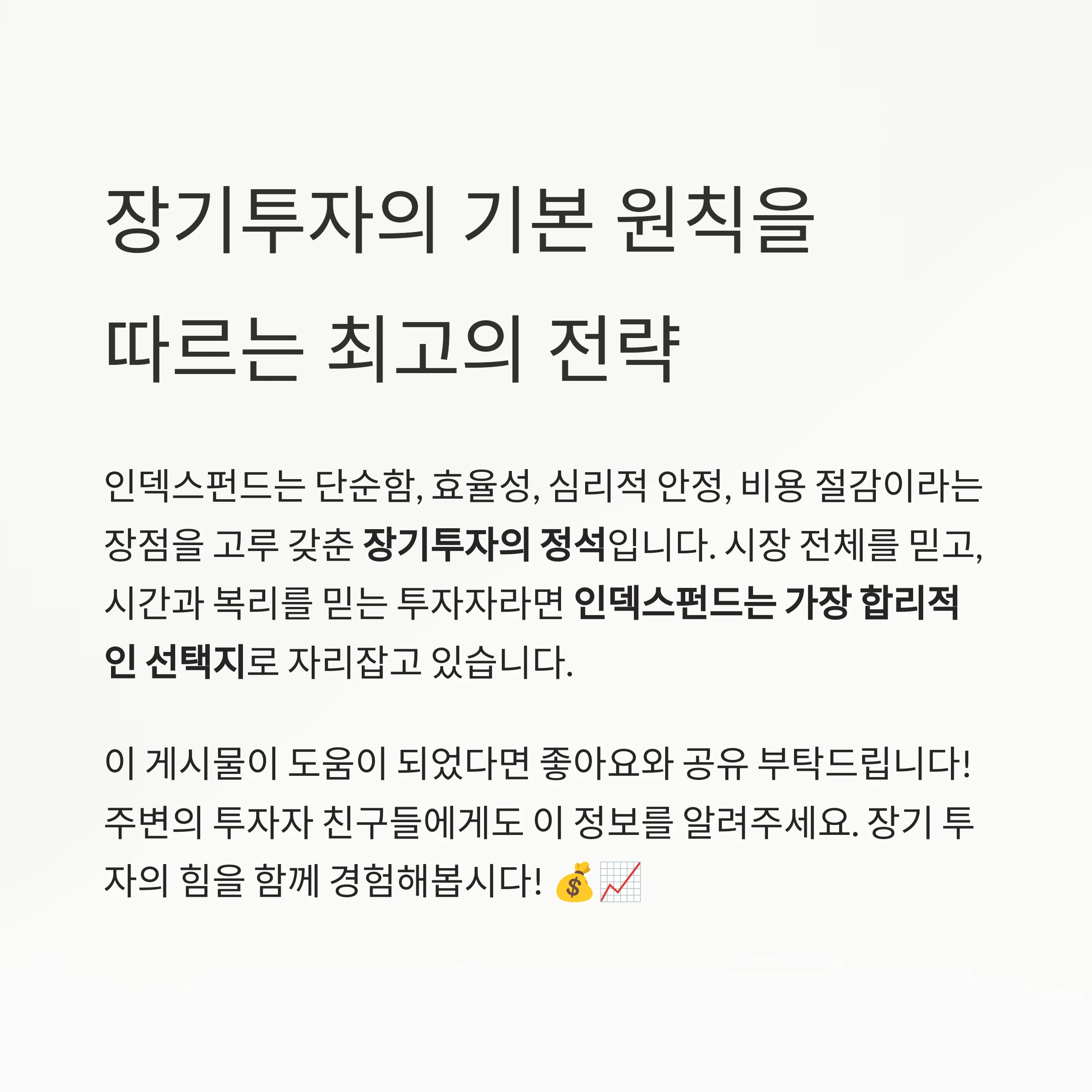 인덱스펀드는 단순함, 효율성, 심리적 안정, 비용 절감이라는 장점을 고루 갖춘 장기투자의 정석입니다.