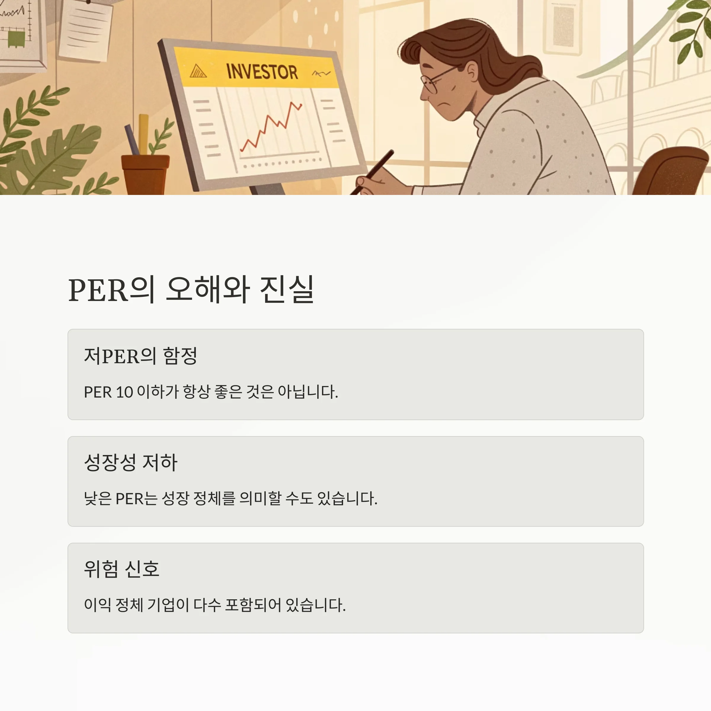 PER이 10 이하이면 저평가로 해석되기도 하지만, 이는 "성장성 저하"를 의미할 수도 있습니다.