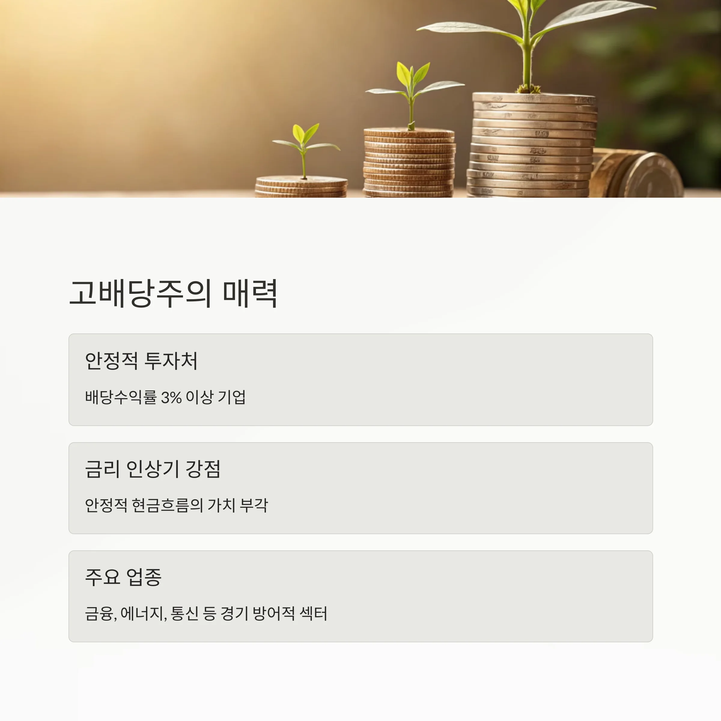 특히 금리 인상기에는 현금 흐름이 안정된 고배당 기업의 매력이 더욱 부각됩니다.