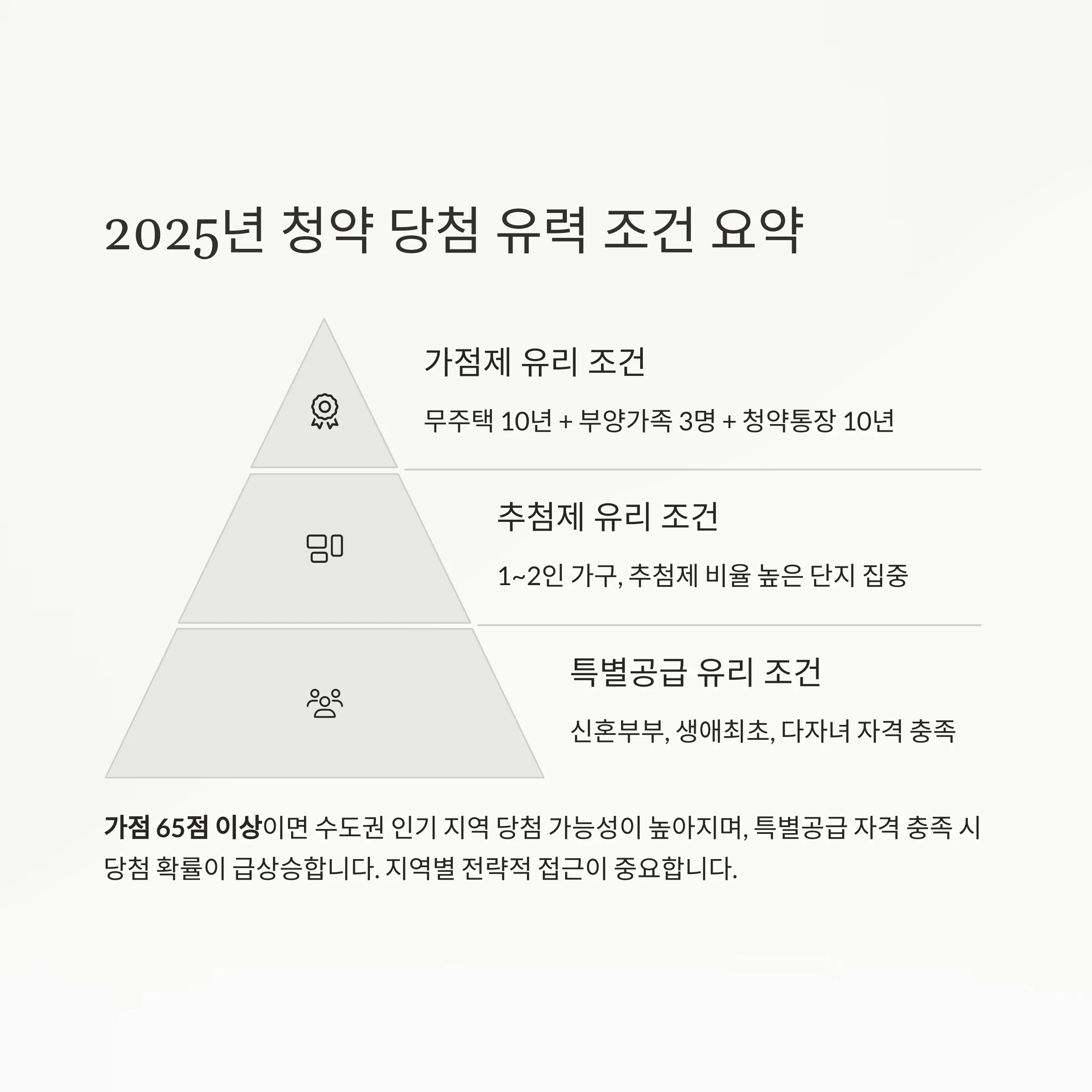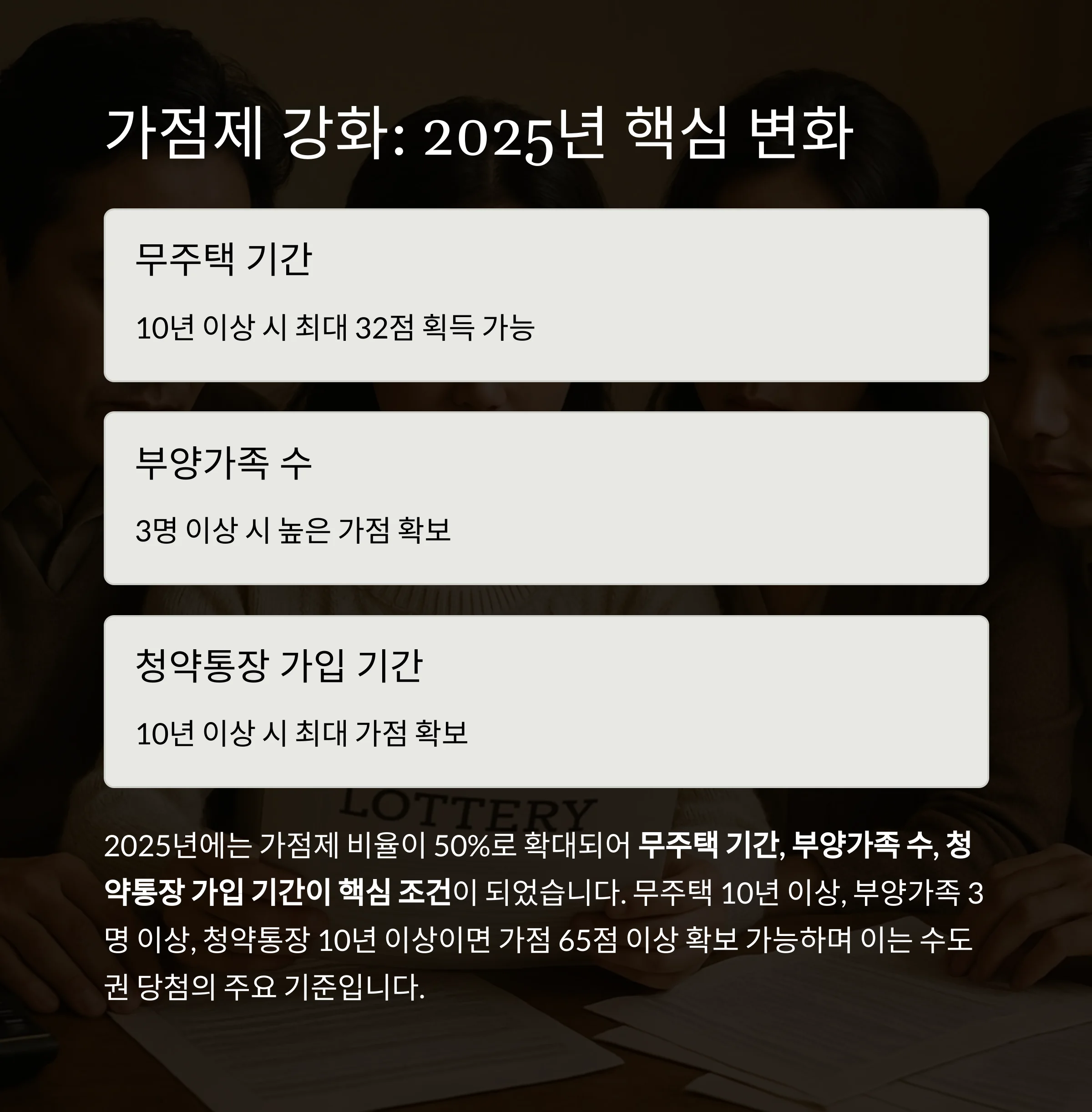 2025년에는 가점제 비율이 50%로 확대되어 무주택 기간, 부양가족 수, 청약통장 가입 기간이 핵심 조건이 되었습니다.