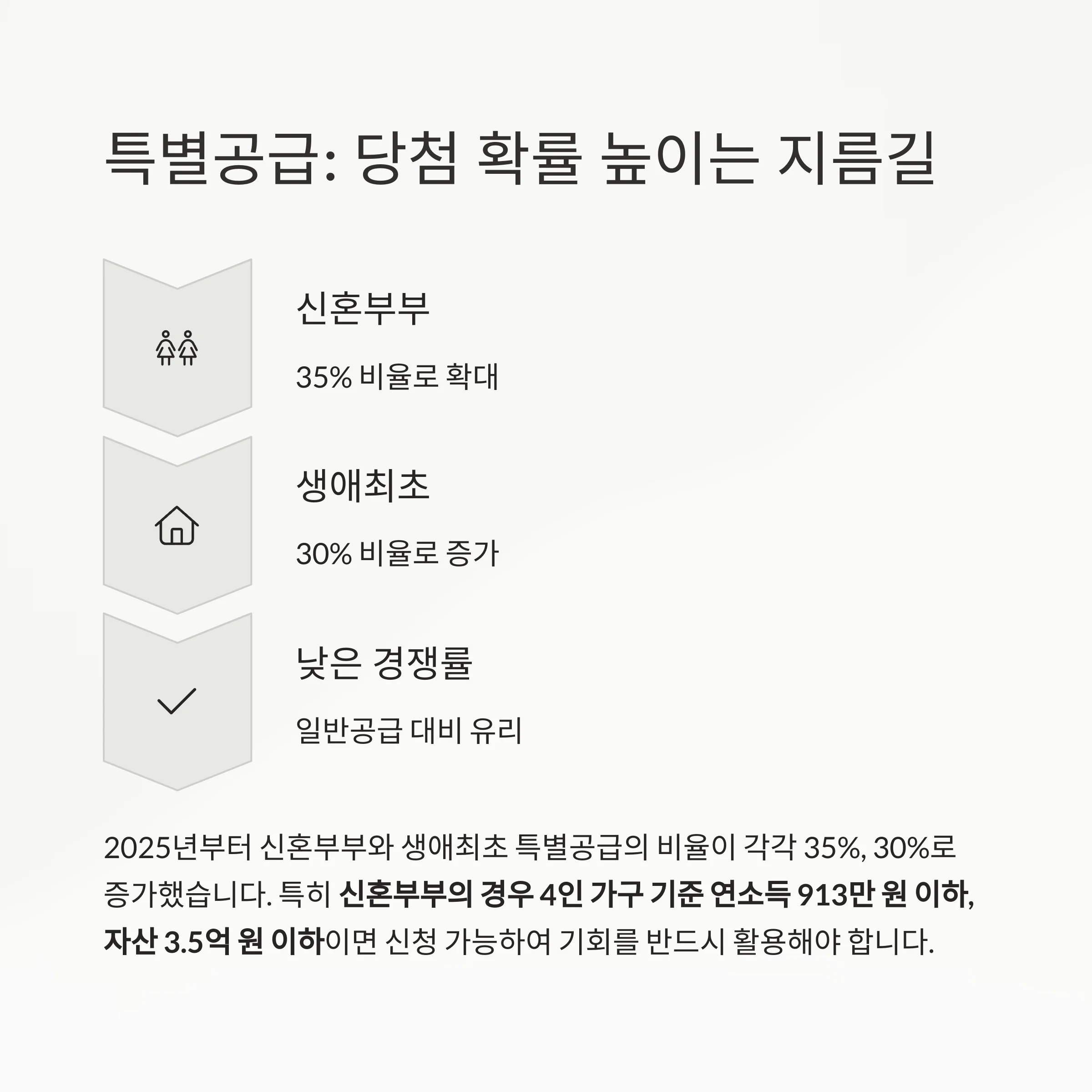 특별공급 중에서도 추첨이 병행되는 경우, 소득과 자산 요건만 충족해도 당첨 가능성이 생깁니다.