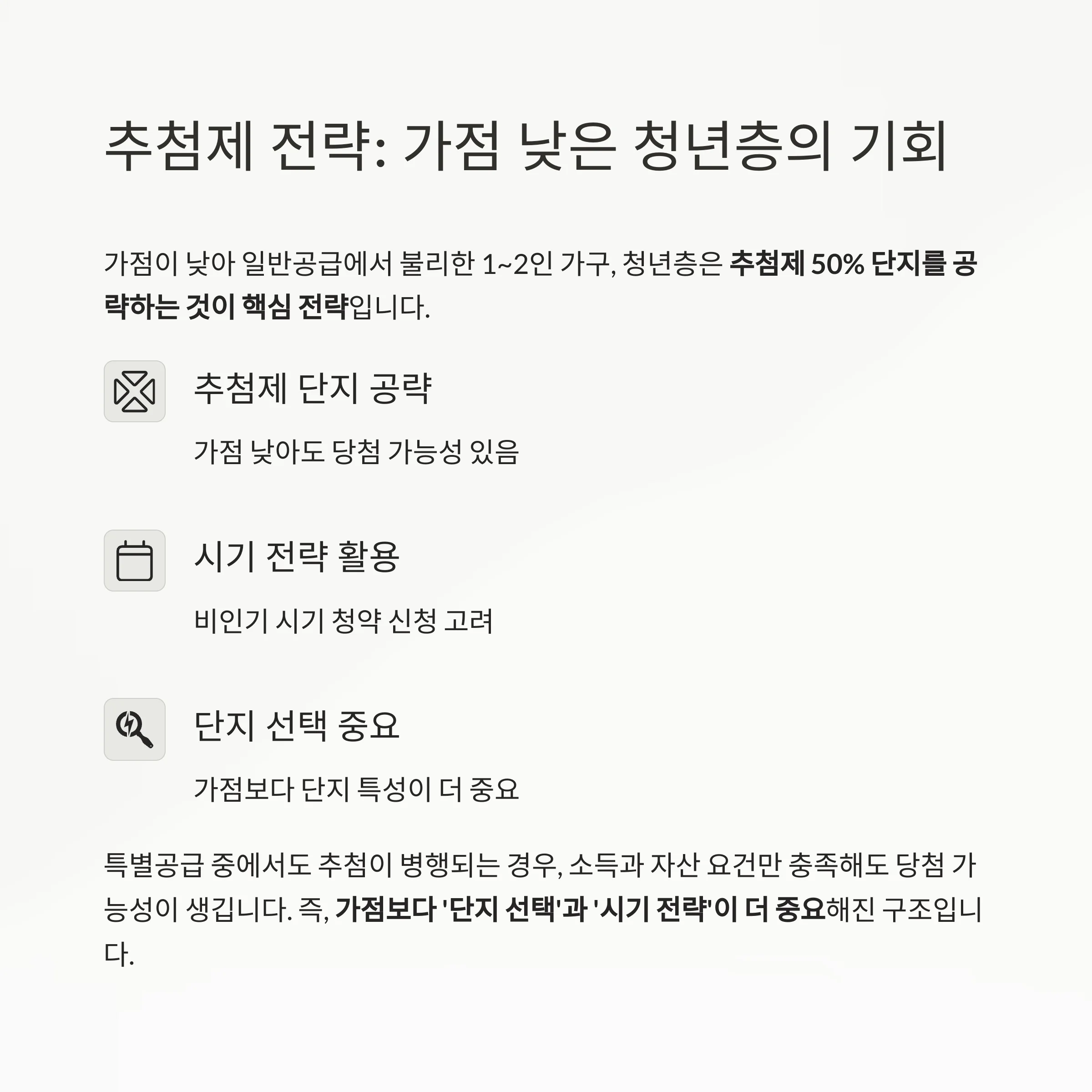 가점이 낮아 일반공급에서 불리한 1~2인 가구, 청년층은 추첨제 50% 단지를 공략하는 것이 핵심 전략입니다.