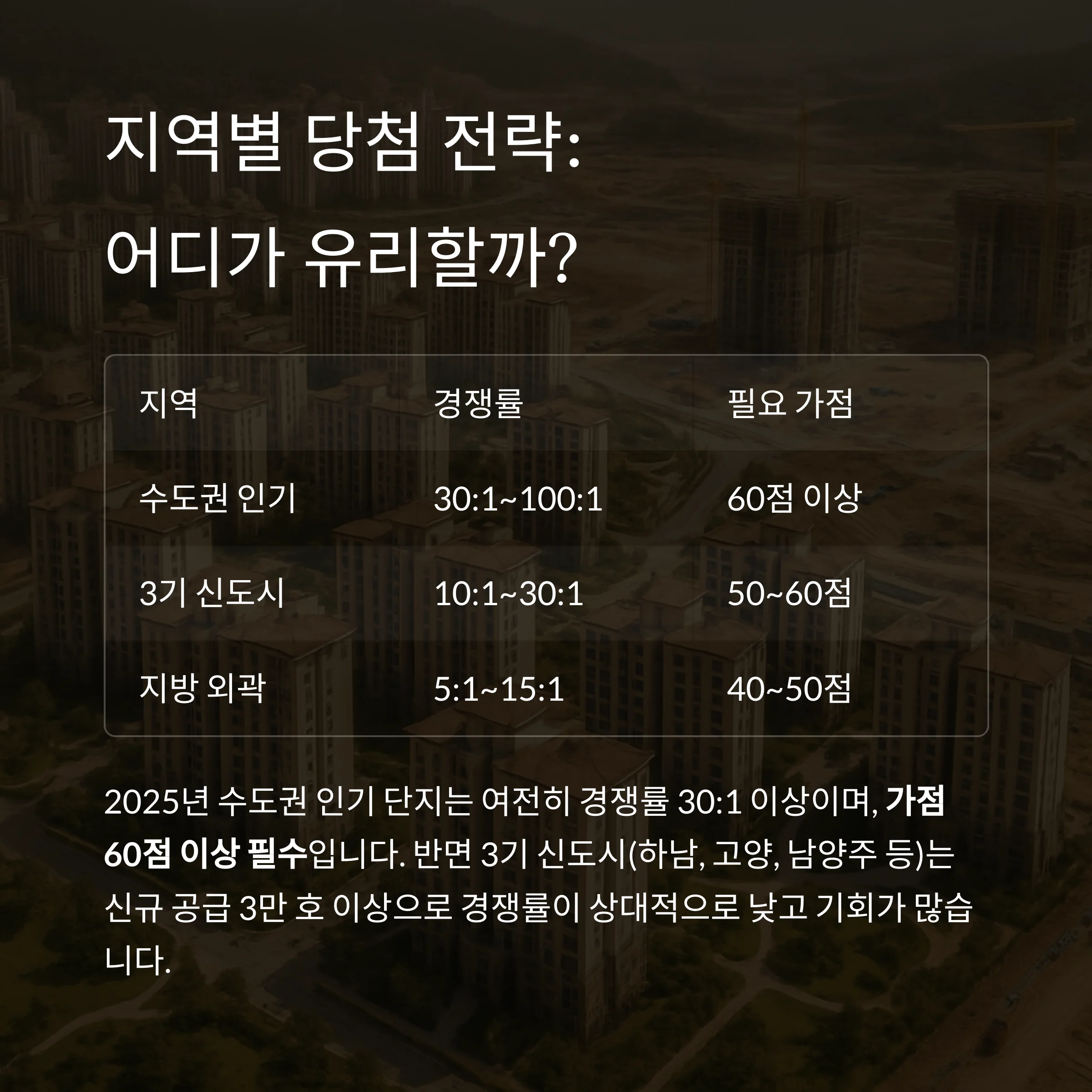 2025년 수도권 인기 단지는 여전히 경쟁률 30:1 이상이며, 가점 60점 이상 필수입니다.