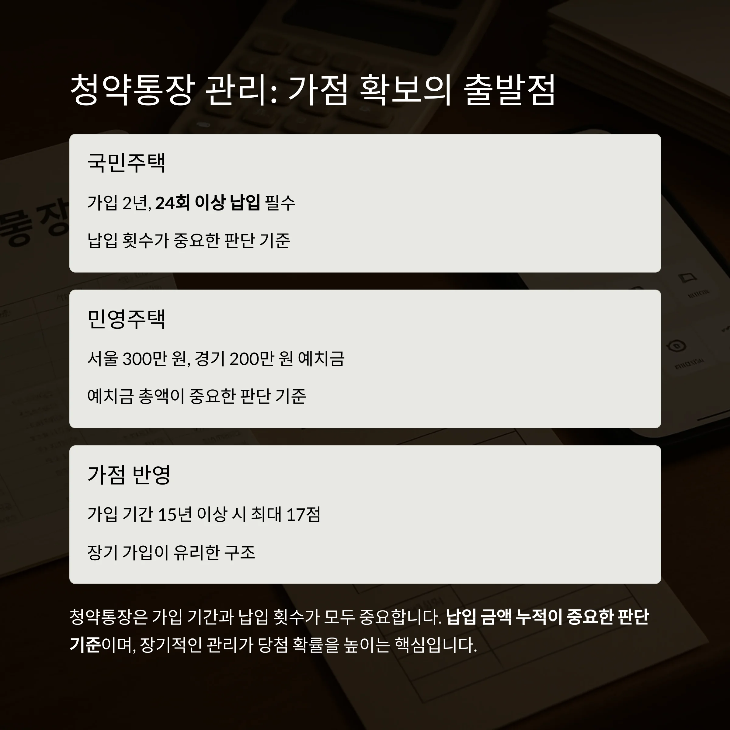 - 청약통장은 납입 횟수와 예치금 관리가 당첨의 출발선입니다