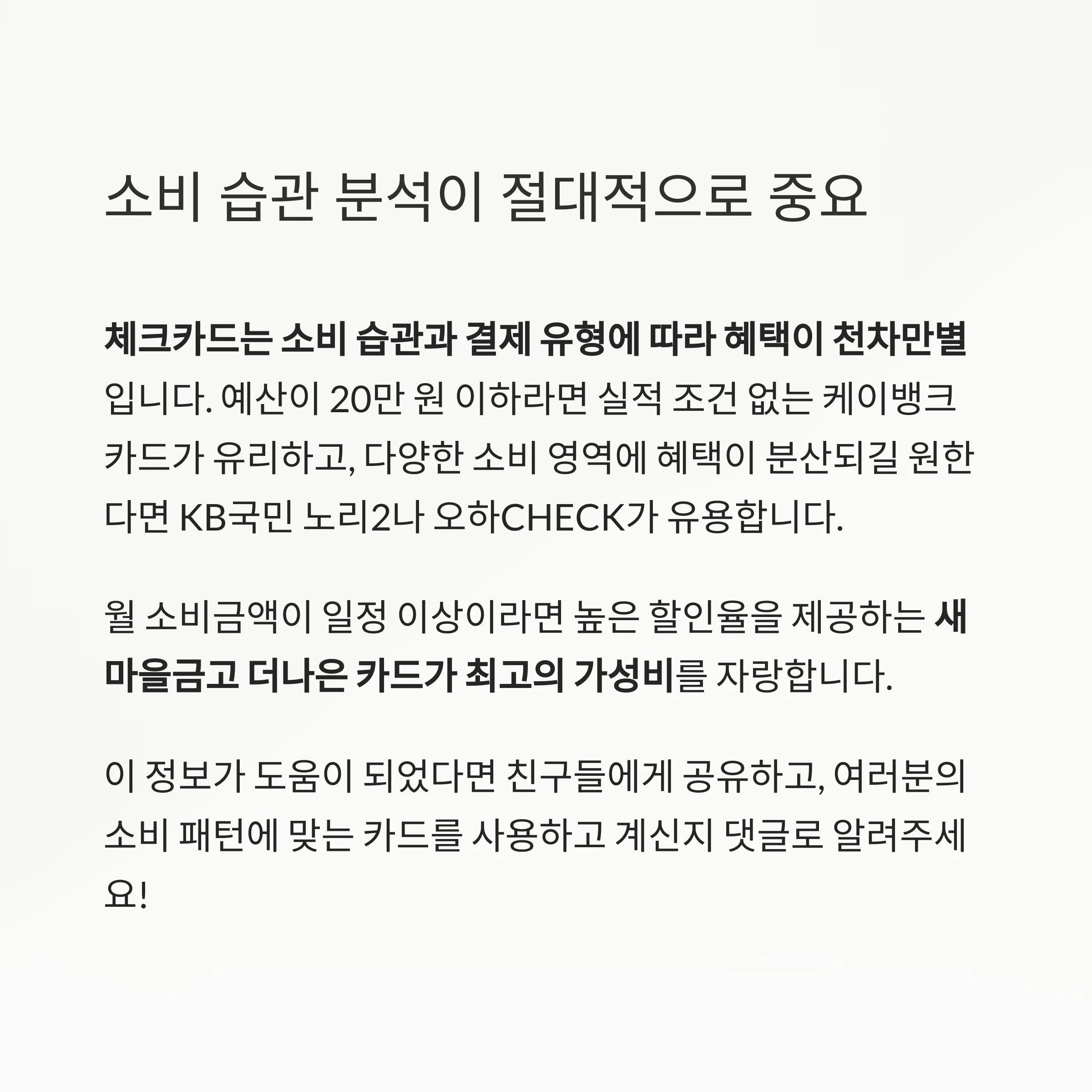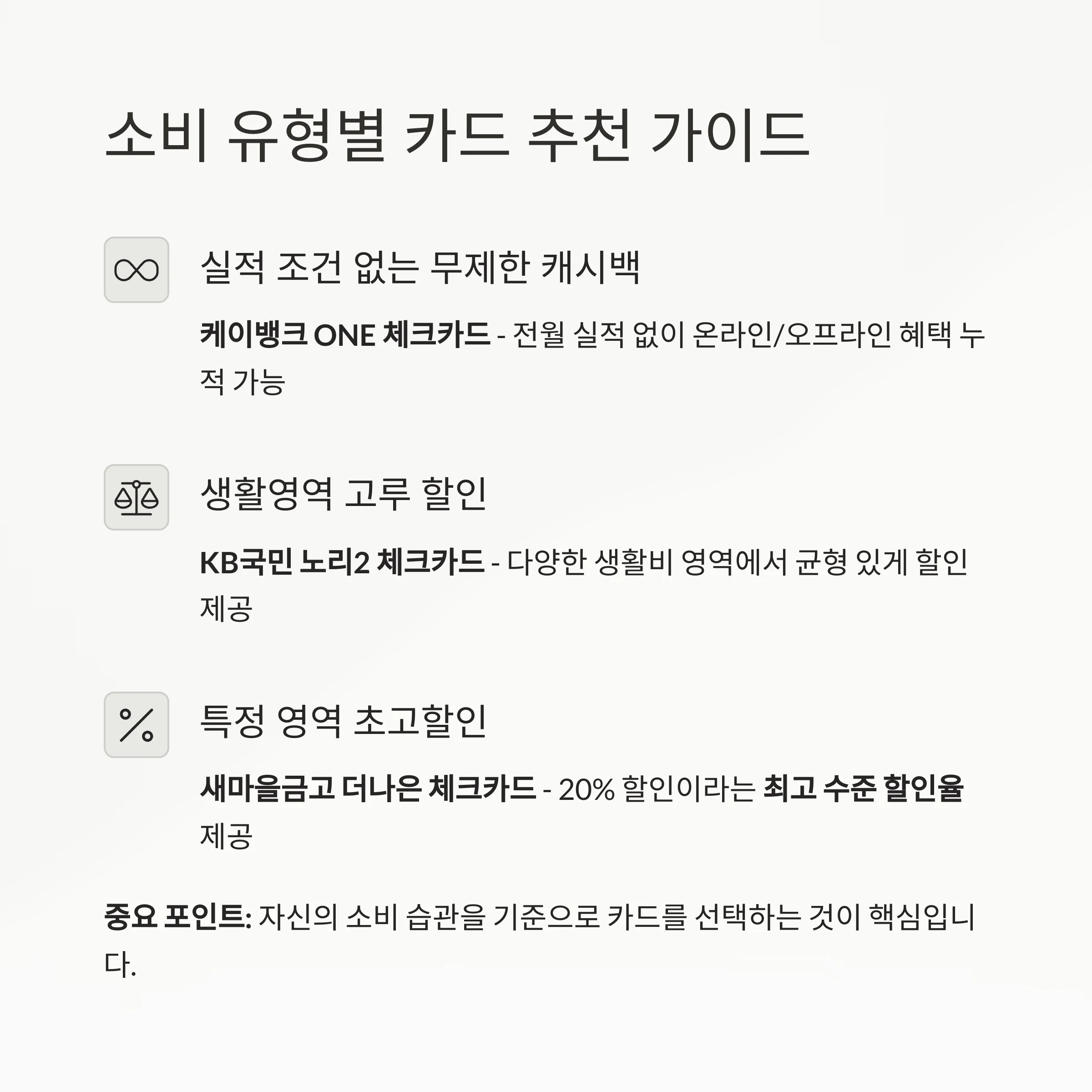 중요 포인트: 자신의 소비 습관을 기준으로 카드를 선택하는 것이 핵심입니다.