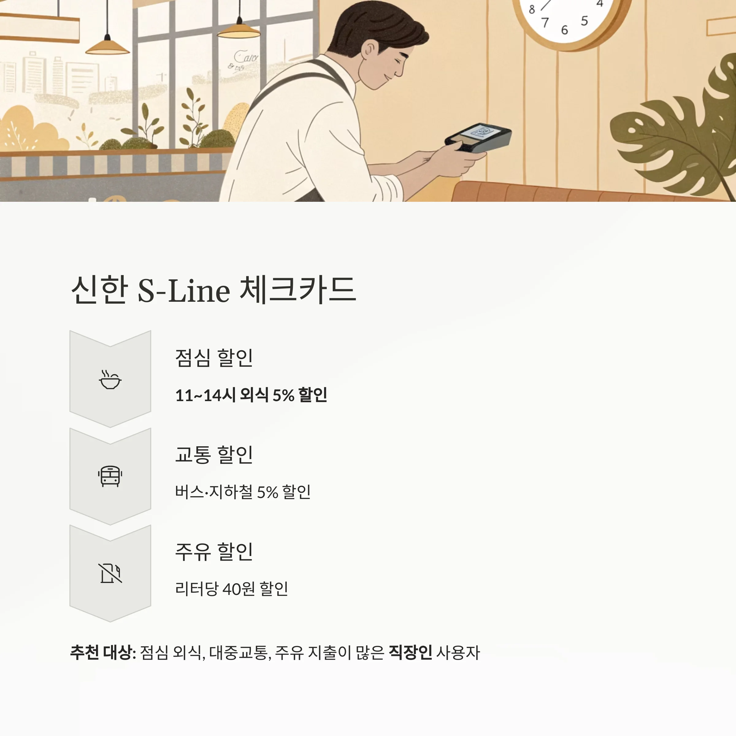 직장인 루틴 중심 신한 S-Line 체크카드 점심, 교통, 주유 등 직장인 전용 맞춤형 혜택